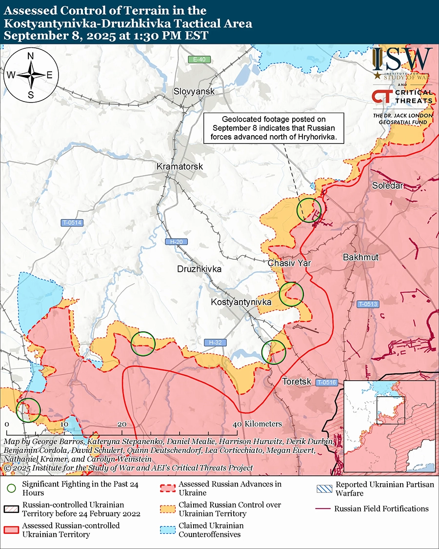 Оценка российского продвижения: геолоцированные кадры, опубликованные 8 сентября, указывают на то, что российские войска недавно продвинулись к северу от Григорьевки (к северо-востоку от Константиновки). [42]