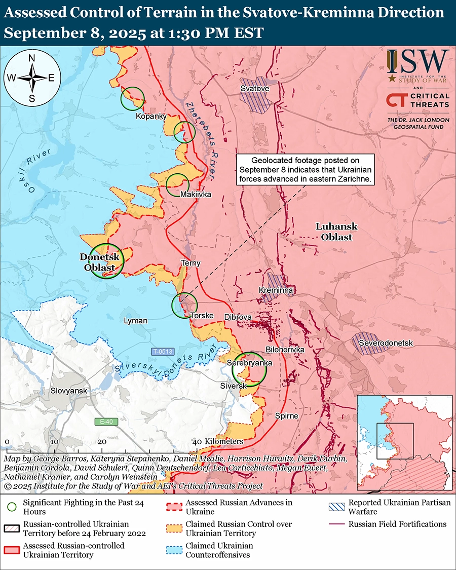 Оценка украинского продвижения: геолоцированные кадры, опубликованные 8 сентября, указывают на то, что украинские войска недавно продвинулись в восточной части Заречного (к востоку от Лимана). [36]