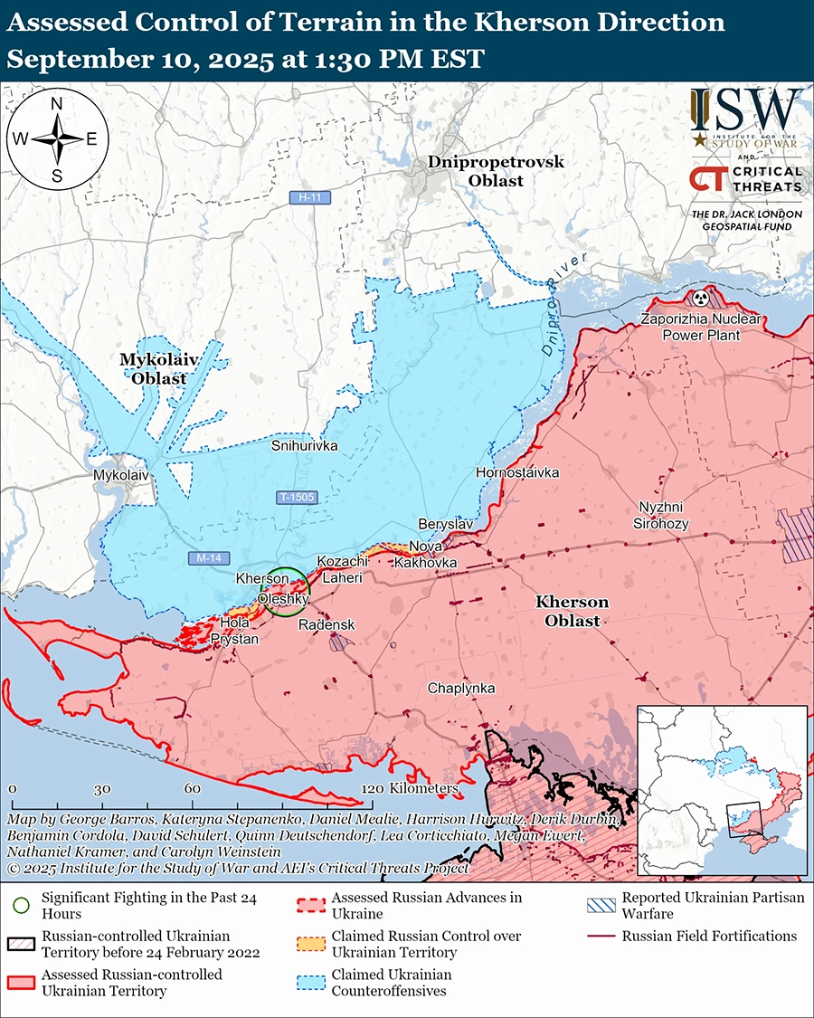 10 сентября российские войска атаковали к северо-востоку от Херсона в районе Антоновки и Садового. [101]