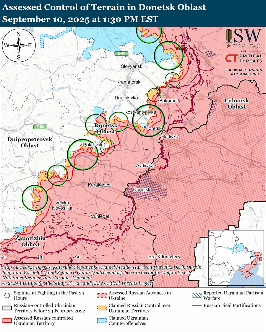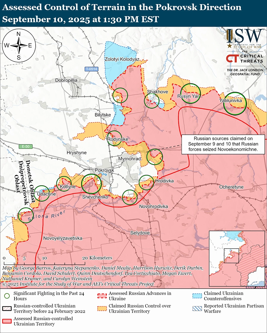 Российские войска вели наступательные действия в самом Покровске и вблизи него; севернее Покровска в районе Родинского; северо-восточнее Покровска в районе Новоэкономического; восточнее Покровска в районе Миролюбовки и Мирнограда; юго-восточнее Покровска в районе Сухого Яра и Лысовки; южнее Покровска в районе Чунышино, Шевченко, Троянды и Новоукраинки; и юго-западнее Покровска в районе Зверево, Котлино и Удачного и в направлении Молодецкого 9 и 10 сентября. [87] Российские военные блогеры утверждали, что украинские войска контратаковали в Покровске и в районах Белецкого (к северу от Покровска), Мирнограда, Мирного и Малиновки (к северо-востоку от Покровска). [88]