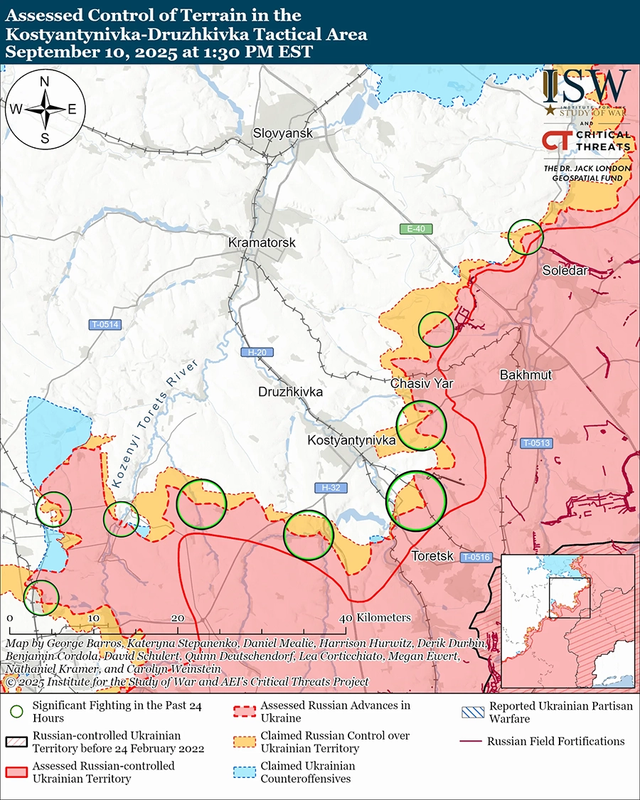 Враг атаковал к северо-востоку от Константиновки вблизи Майского; к востоку от Константиновки в районе Ступочков и Предтечино; юго-восточнее Константиновки в районах Нелиповки, Щербиновки и Плещеевки и в направлении Александро-Шультино; к югу от Константиновки в районах Катериновки, Яблоновки и Клебан-Быка; к юго-западу от Константиновки в районе Степановки; южнее Дружковки в районе Полтавки и Русина Яра; и юго-западнее Дружковки в районе Владимировки и Софиевки 9 и 10 сентября. [70] Российские военные блогеры утверждали, что украинские войска контратаковали в Предтечино и Катериновке. [71]