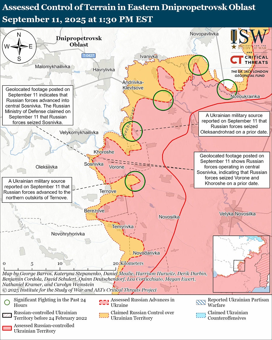 Российские войска вели наступательные операции северо-восточнее Великомихайловки в районе Лесного, Поддубного и Мирного; восточнее Великомихайловки в районе Сечневого и Александрограда; и юго-восточнее Великомихайловки в районе Малиевки, Камышевахи, Новогеоргиевки, Запорожского, Обратного, Малиевки, Сечневого, Зеленого поля, Новониколаевки и Тернового 10 и 11 сентября.[97]
