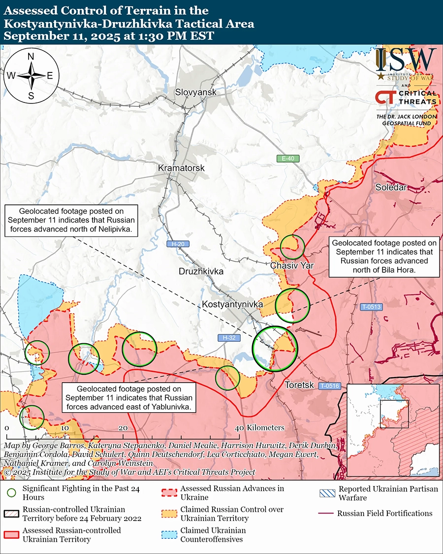 Оценка продвижения противника: геолоцированные кадры, опубликованные 11 сентября, указывают на то, что российские войска продвинулись в полях к северу от Белой Горы (к юго-востоку от Константиновки). [63] На дополнительных геолоцированных кадрах, опубликованных 11 сентября, видно, что российские войска продвинулись на запад вдоль дороги Т0516 Торецк – Константиновка в восточной части Нелиповки (также к юго-востоку от Константиновки). [64] На геолоцированных кадрах, опубликованных 11 сентября, также видно, что российские войска продвинулись к лесопосадке к северу от Яблоновки (к юго-западу от Константиновки). [65]