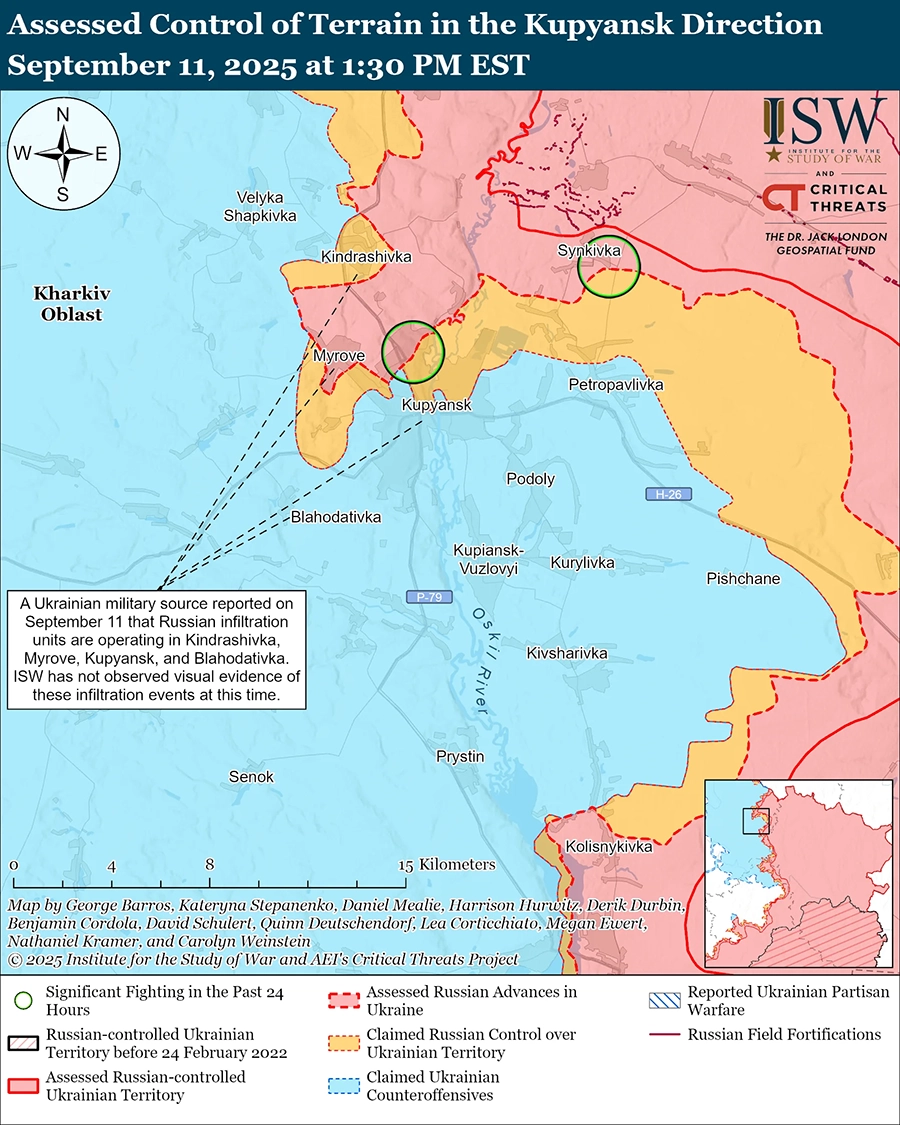 Украинский военный обозреватель Константин Машовец сообщил 11 сентября, что украинские силы наблюдали российские группы проникновения в составе от двух до шести человек, действующие вблизи Купянска, Благодатовки (к западу от Купянска), Кондрашовки и Мирово (оба к северо-западу от Купянска). [42] Машовец сообщал, что российские силы проникновения используют леса и городскую застройку для маскировки, переодеваются в гражданскую одежду и передвигаются в ночное время. Машовец заявил, что 1-я гвардейская танковая армия (ГТА, Московский военный округ [МВО]) и 6-я общевойсковая армия (ОА, Ленинградский военный округ [ЛВО]) также интенсифицируют классические штурмовые операции и сочетают тактику штурма и инфильтрации.