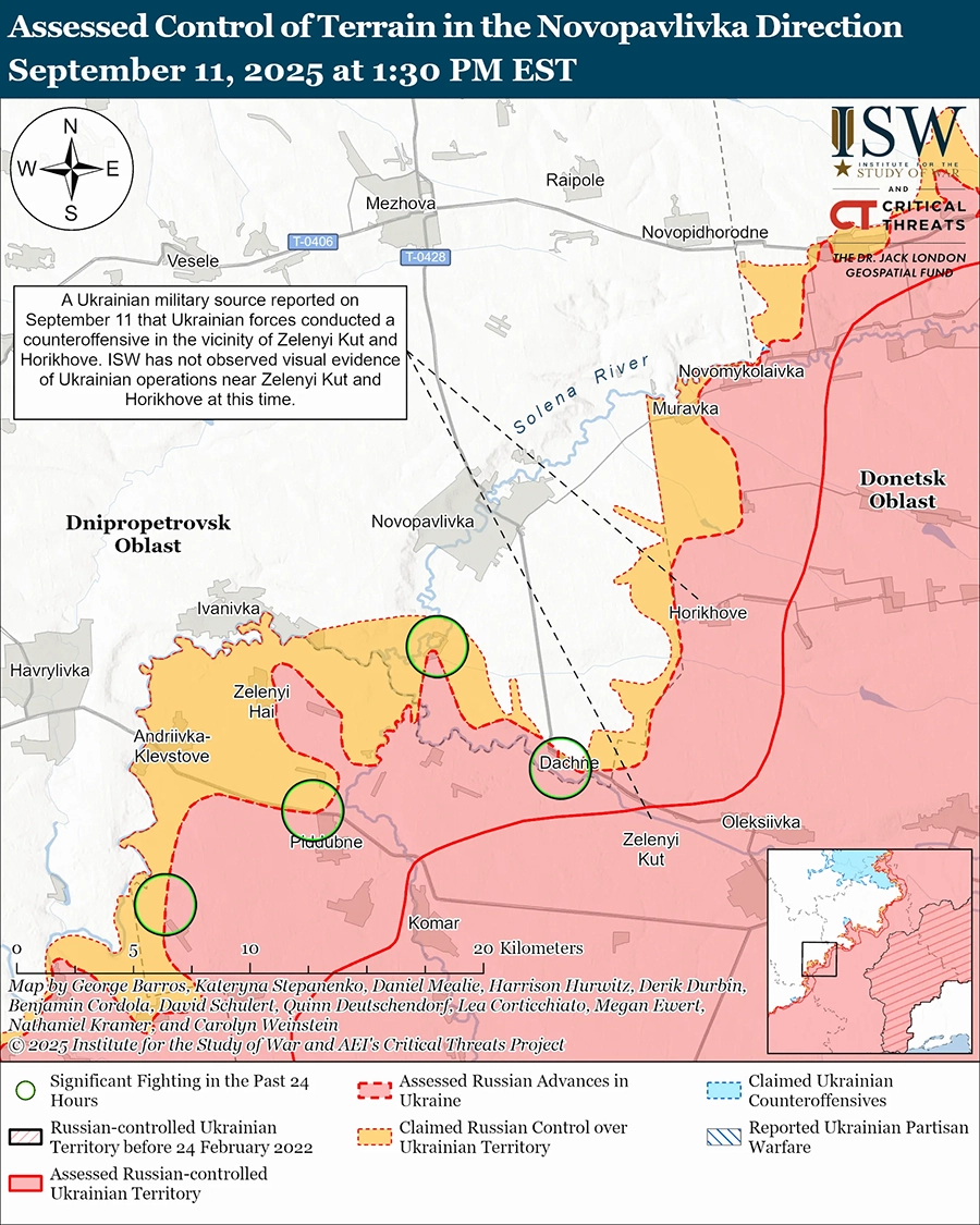 Украинский военный обозреватель Константин Машовец сообщил 11 сентября, что украинские войска контратакуют в районе Гороховое (к юго-востоку от Новопавловки) и недавно оттеснили российские войска к востоку от административной границы Днепропетровской и Донецкой областей вдоль линии Гороховое и Зеленый Кут, вернув до 14 квадратных километров. [89] По данным Машовца, подразделения 29-й общевойсковой армии РФ (Восточный военный округ) отвечают на украинское контрнаступление. Машовец заявил, что части российских войск выдвинули в район для ответных действий подразделения 1-й гвардейской танковой армии (ГТА) и 239-го танкового полка (90-я танковая дивизия, 41-я ОА, ЦВО), а также что подразделения 137-й мотострелковой бригады и 1195-го мотострелкового полка (оба из 41-й ОА), ЦВО), как сообщается, отбив пять квадратных километров в этом районе. [90]