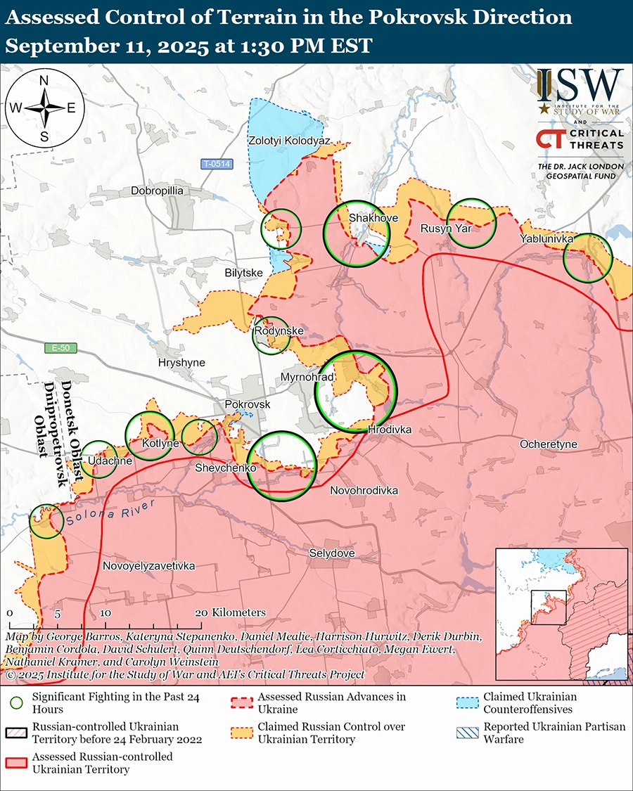 Российские войска вели наступательные действия в самом Покровске и вблизи него; севернее Покровска в районе Родинского; северо-восточнее Покровска в районе Новоэкономического, Заповедного и Красного Лимана; восточнее Покровска в районе Миролюбовки и Проминя; юго-восточнее Покровска в районе Лысовки; южнее Покровска в районе Чунышино и Новоукраинки; и юго-западнее Покровска в районе Зверево, Котлино и Удачного 10 и 11 сентября. [81]
