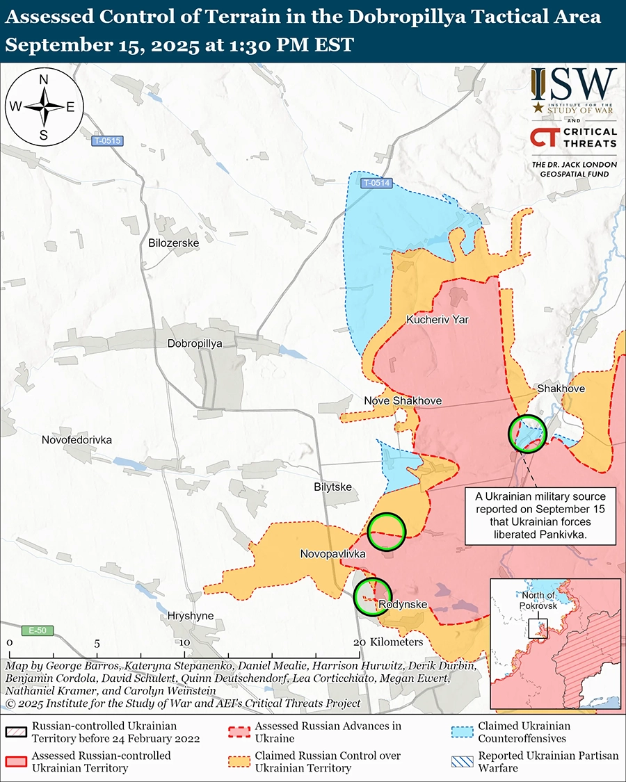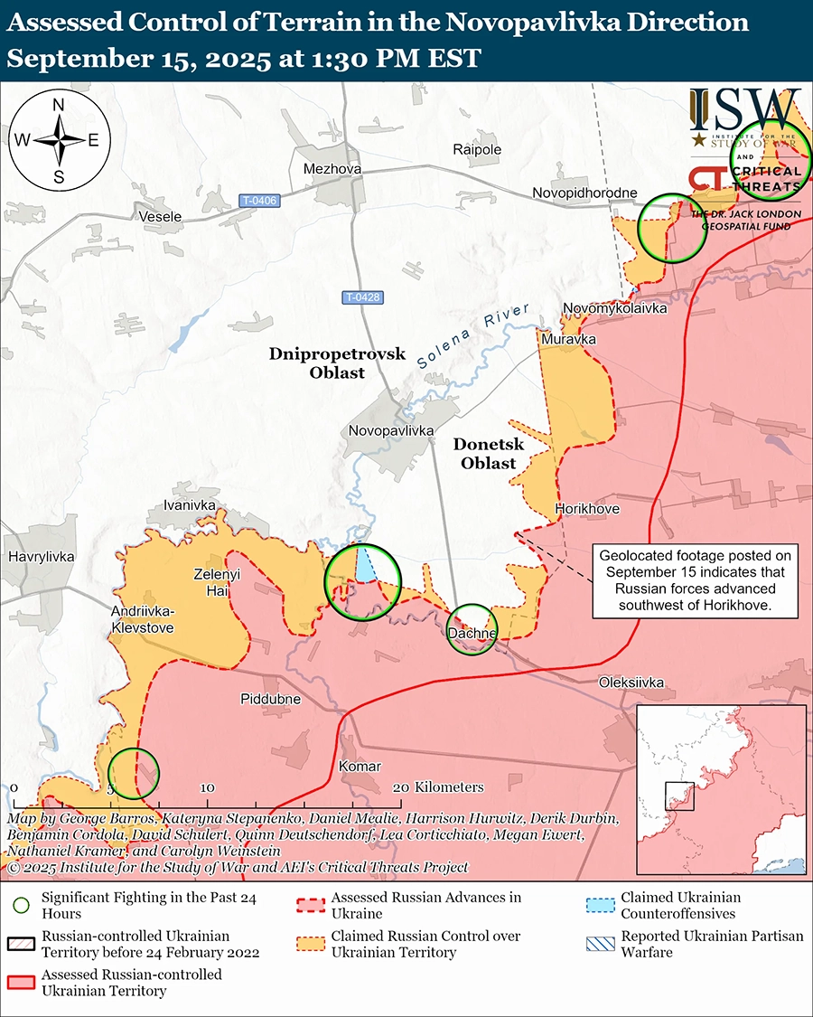 Оценка российского продвижения: геолоцированные кадры, опубликованные 15 сентября, указывают на то, что российские войска недавно продвинулись к юго-западу от Гороховое (к востоку от Новопавловки). [70]