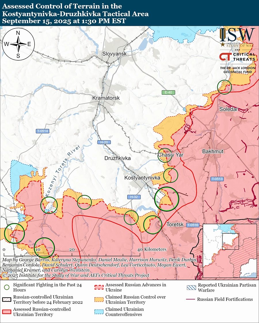 Враг атаковал северо-восточнее Константиновки в районе Часова Яра; к востоку от Константиновки в районе Ступочки и Предтечино; к юго-востоку от Константиновки в районах населенных пунктов Александро-Шультино, Белая Гора, Плещеевка и Клебан Бык; к югу от Константиновки в районе Катериновки, Щербиновки и Александро-Калиново; к юго-западу от Константиновки в направлении Степановки; южнее Дружковки в районе Полтавки и Русиного Яра; и юго-западнее Дружковки в районе Владимировки и Софиевки 14 и 15 сентября. [52] Российский военный блогер утверждал, что украинские войска нанесли удар в районе Русина Яра. [53]