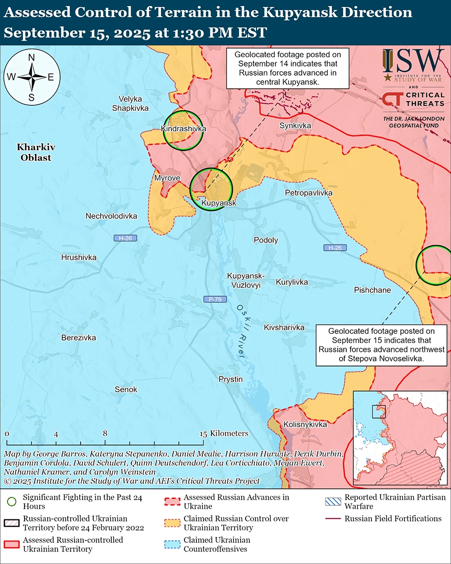 Оценка российского продвижения: геолоцированные кадры, опубликованные 14 и 15 сентября, указывают на то, что российские войска недавно продвинулись в центре Купянска и к юго-западу от Степной Новоселовки (к юго-востоку от Купянска). [36]