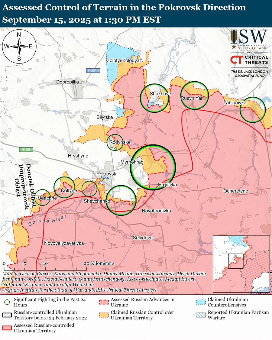 Враг вел наступательные действия к северу от Покровска в районах населенных пунктов Родинское и Сухоцкое; северо-восточнее Покровска в районе Новоэкономического и Федоровки; к востоку от Покровска в районе Мирнограда и Проминя; юго-восточнее Покровска в районе Лысовки; южнее Покровска в районе Новоукраинки; и юго-западнее Покровска в районе Котлино, Удачного и Зверево и в направлении Молодецкого и Новоподгородного 14 и 15 сентября. [66]