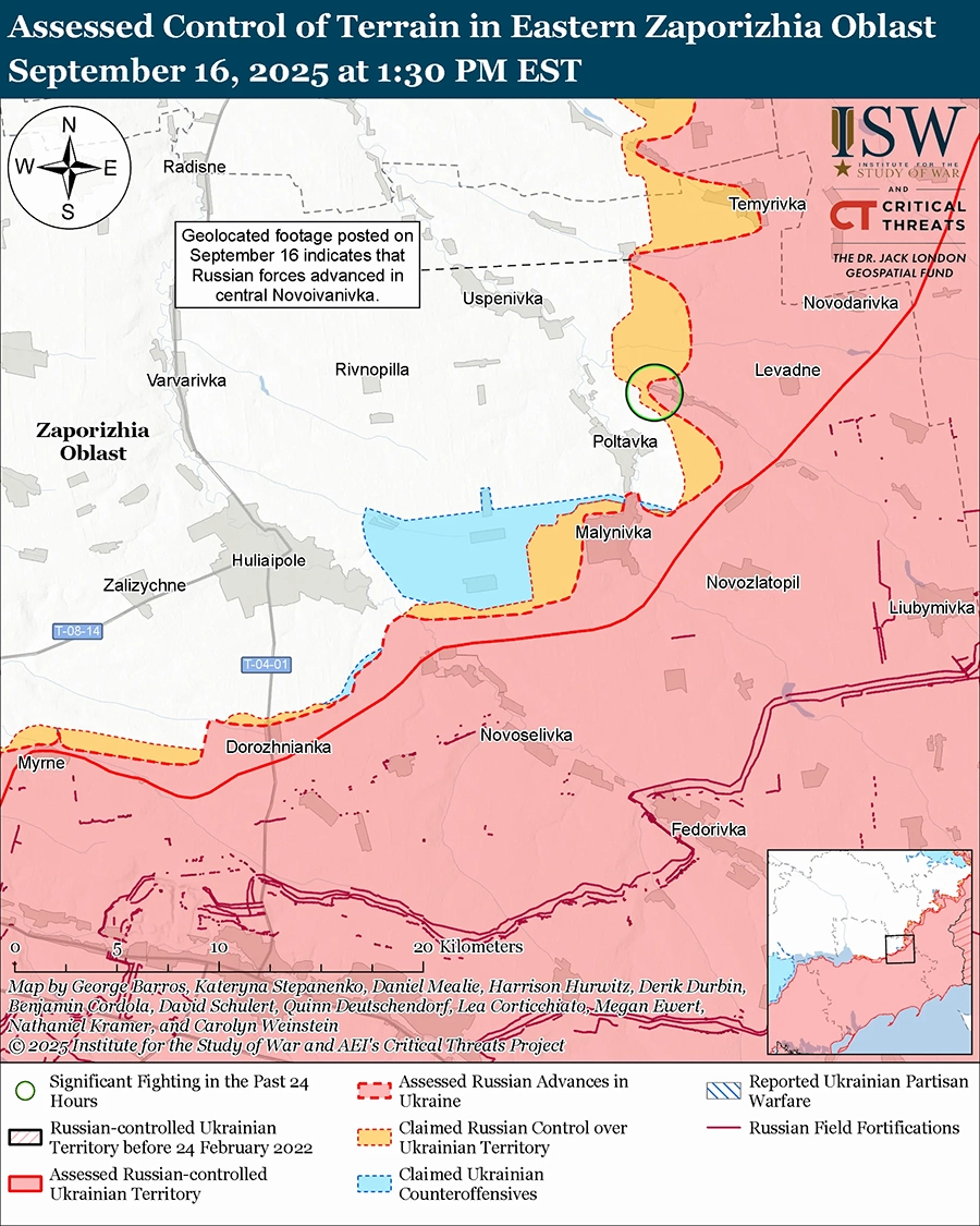 Оценка продвижения России: геолоцированные кадры, опубликованные 16 сентября, указывают на то, что российские войска недавно продвинулись в юго-восточную часть Новоивановки (к северо-востоку от Гуляйполя). [78] По оценкам ISW, российские войска могут попытаться использовать наступление на западе Донецкой области для наступления на запад в северо-восточную Запорожскую область, если российское командование сочтет, что большинство оборонительных укреплений на передовой ориентированы с востока на запад для атак с юга, а не с севера на юг для атак с востока. [79]