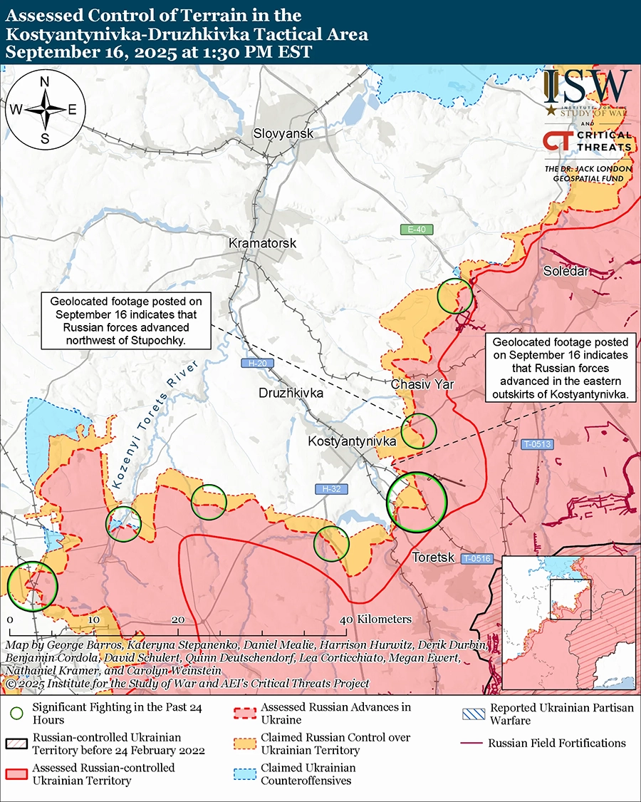 Враг атаковал северо-восточнее Константиновки в районах населенных пунктов Орехово-Васильевка и Николаевка; к востоку от Константиновки в районе Ступочек; юго-восток от Константиновки в районе Белой Горы и Плещеевки; к югу от Константиновки в районе Иванополя, Щербиновки и Катериновки; южнее Дружовки в районе Полтавки и Русина Яра; и юго-западнее Дружовки в районе Владимировки и Софиевки 15 и 16 сентября. [64] Российский военный блогер утверждал, что украинские войска контратаковали в районе Полтавки и Русиного Яра. [65]