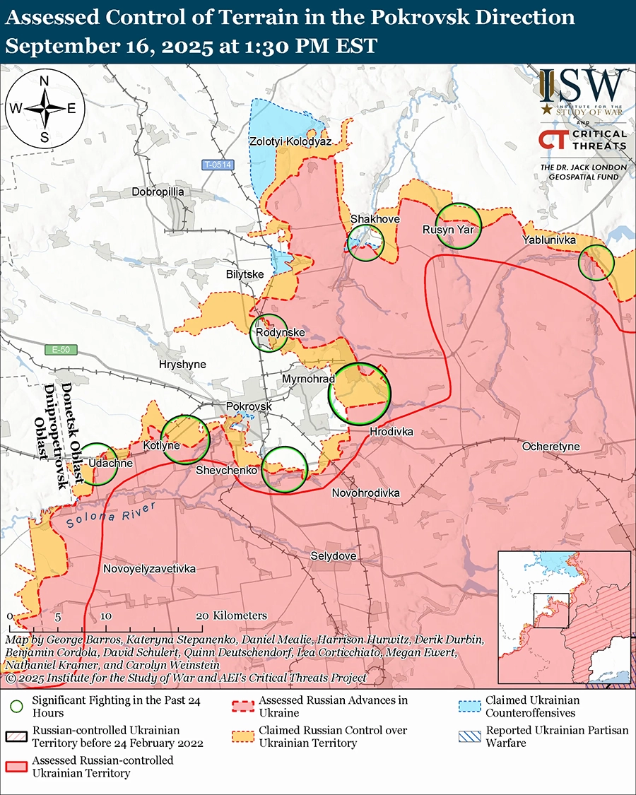 Российские войска атаковали к северу от Покровска в районе Родинского; северо-восточнее Покровска в районе Новоэкономического и Красного Лимана; восточнее Покровска в районе Мирнограда, Казацкого и Проминя; юго-восточнее Покровска в районе Лысовки; южнее Покровска в районе Новоукраинки и Шевченко; и юго-западнее Покровска в районе Котлино, Удачного и Зверево и в направлении Молодецкого и Новопездного 15 и 16 сентября. [70]