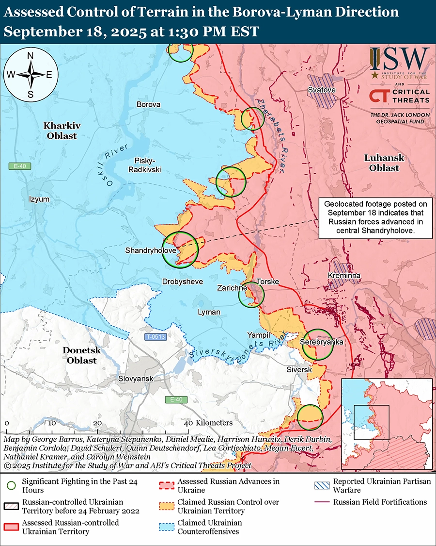 Оценка российского продвижения: геолоцированные кадры, опубликованные 18 сентября, указывают на то, что российские войска недавно продвинулись к центру Шандриголово (к северо-западу от Лимана). [75]