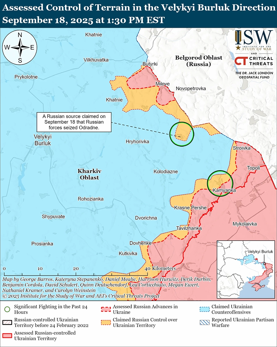 17 и 18 сентября российские войска атаковали к северо-востоку от Великого Бурлука в районе Меловое и в направлениях Хатного и Амбарного, а также к востоку от Великого Бурлука в районе Отрадного и в направлении Григорьевки и Обуховки. [64]