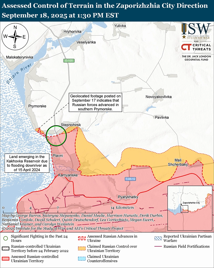 Оценка российского продвижения: геолоцированные кадры, опубликованные 17 сентября, указывают на то, что российские войска недавно продвинулись в южном Приморском (к северо-западу от Орехова). [124]