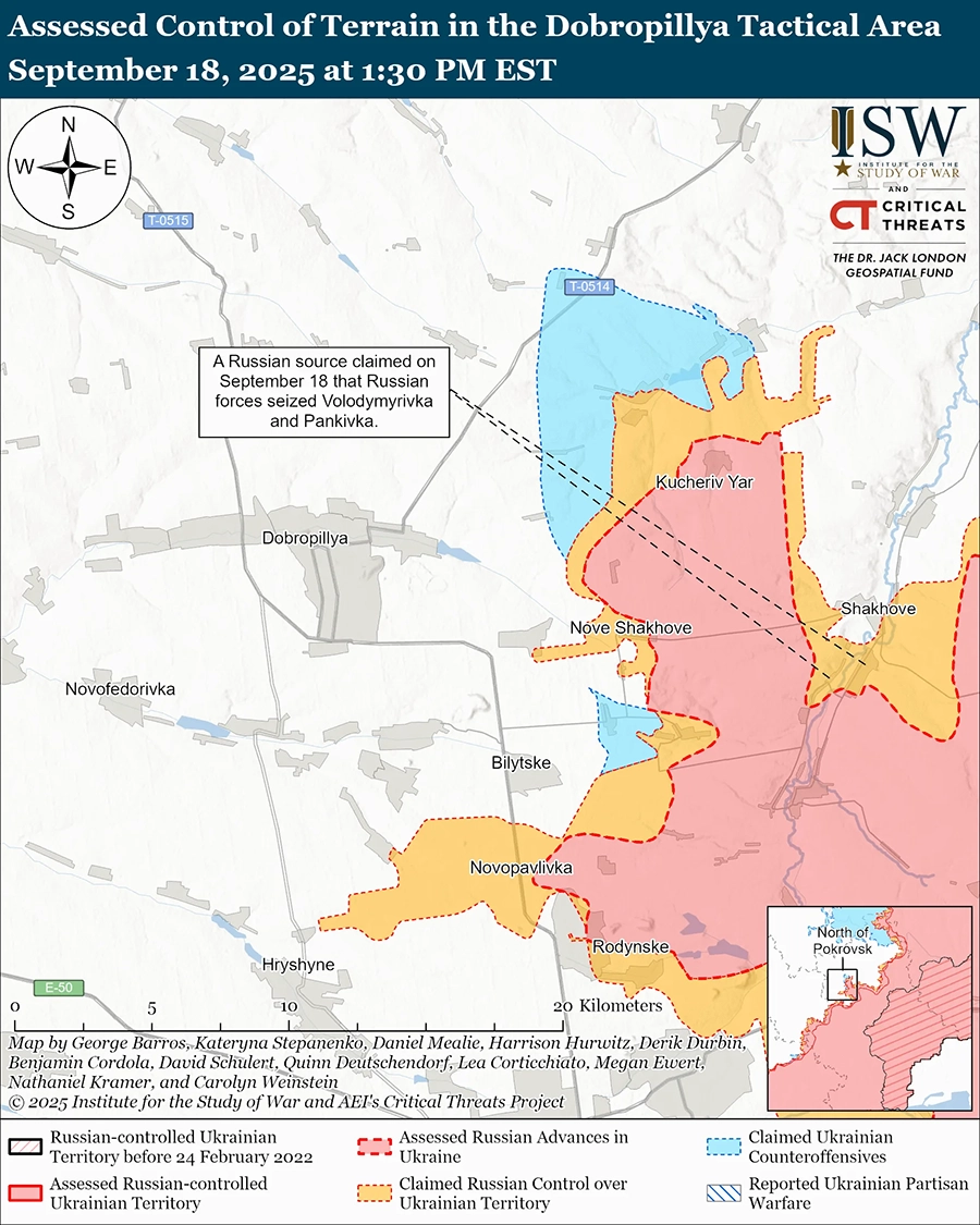 Главнокомандующий войсками Украины генерал Александр Сырский 18 сентября сообщил президенту Украины Владимиру Зеленскому, что украинские войска освободили 160 квадратных километров и семь неуказанных населенных пунктов, а также зачистили более 170 квадратных километров и девять неуказанных населенных пунктов в продолжающемся контрнаступлении украинских сил в тактическом районе Доброполье. [97] По оценкам ISW, Сырский имеет в виду Петровку, Веселое, Грузное, Рубежное, Золотой Колодязь, Дорожное, Степные (все к северо-востоку от Доброполья) и, вероятно, либо Паньковку, либо Шахово, либо Ивановку (к северо-востоку, востоку и юго-востоку от Доброполья соответственно). Командир украинского подразделения, действующего в тактическом районе Доброполье, сообщил, что украинские войска изолировали российские войска в районе Кучерова Яра примерно с 28 августа. [98]