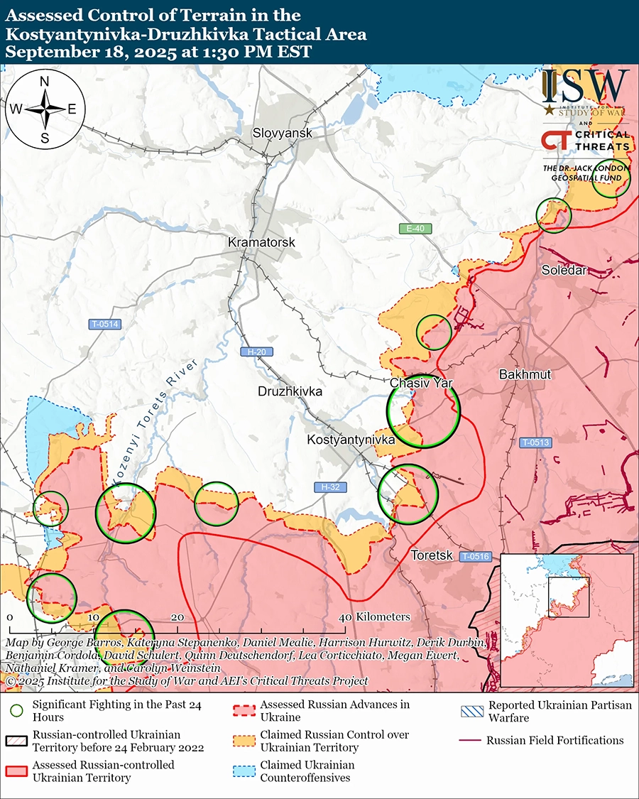Представитель украинской бригады, действующей на направлении Константиновка-Дружковка, сообщил, что российские войска пытаются перекрыть украинские наземные линии коммуникаций (НЛК) и атакуют украинские передовые позиции под Торецком. [89] Представитель бригады отметил, что российские операторы беспилотников сосредоточены на нанесении ударов по украинским НЛК на расстоянии от пяти до 10 километров в ближнем тылу, а российские войска продолжают перебрасывать пары солдат для проникновения в украинскую оборону и создания пункта сбора. Командир украинского подразделения, действующего в тактическом районе Доброполье, сообщил, что украинские войска примерно с 28 августа окружают российские войска в районе Владимировки (к юго-западу от Дружковки). [90]