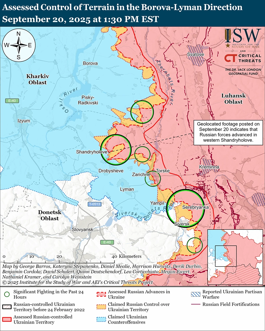 Оценка российского продвижения: геолоцированные кадры, опубликованные 20 сентября, указывают на то, что российские войска недавно продвинулись в восточной части Шандриголово (к северо-западу от Лимана). [54]