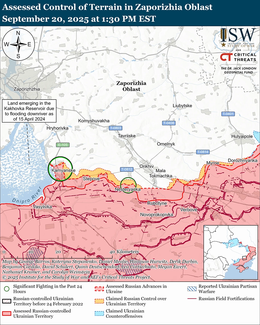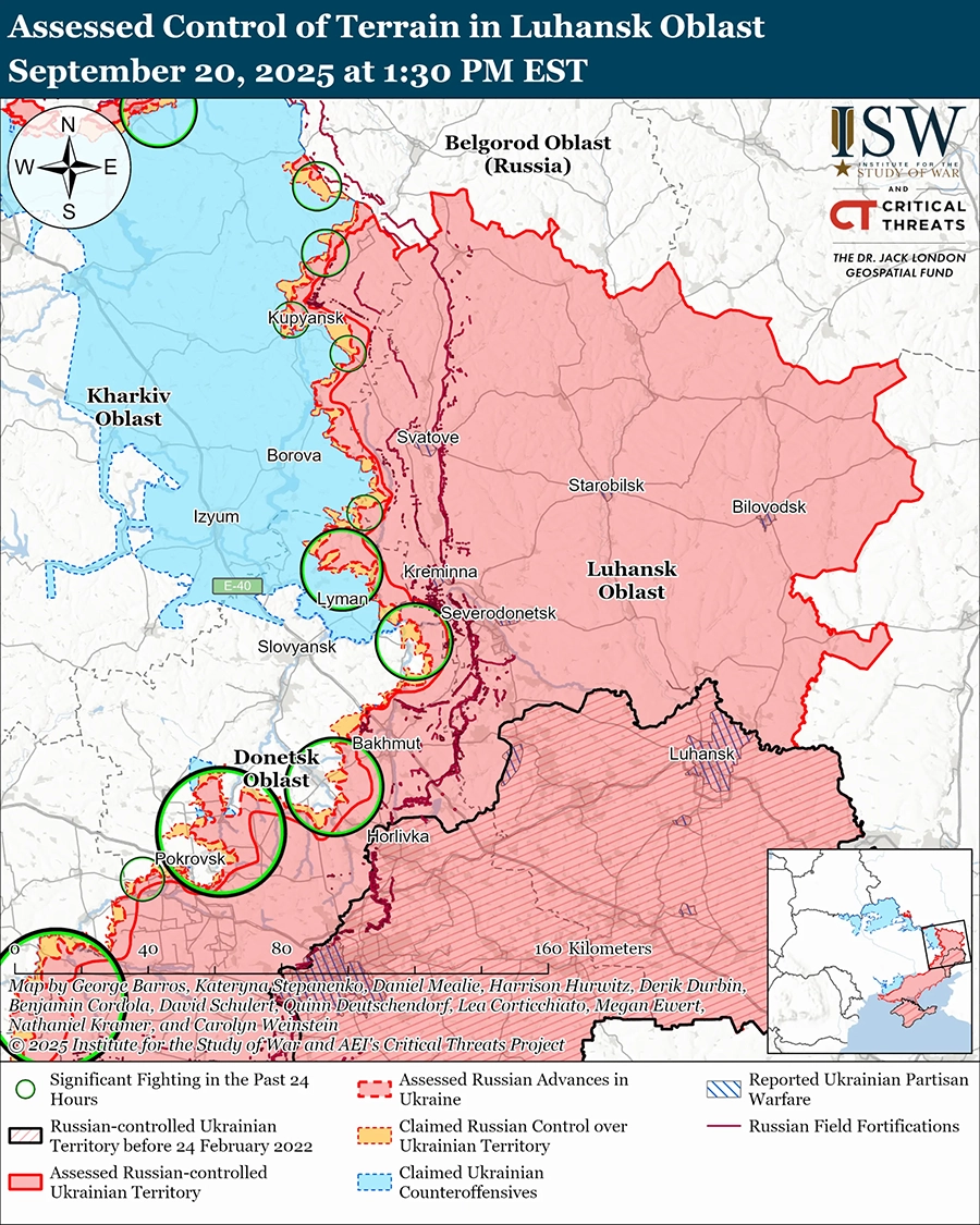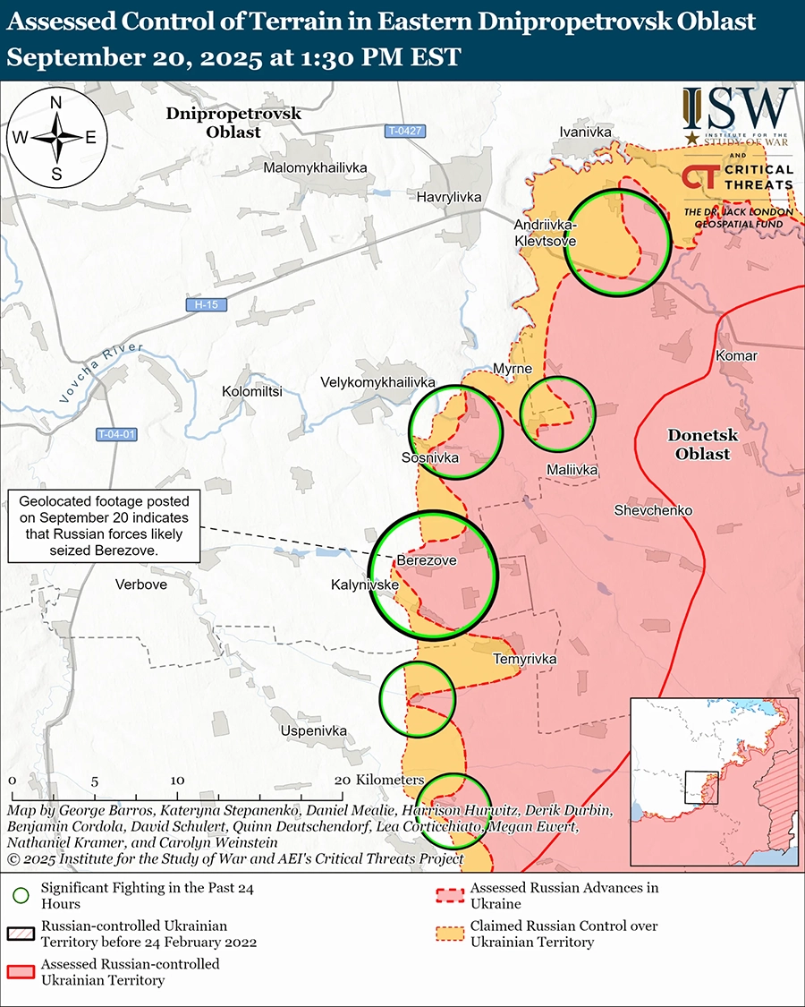 Оценка украинского наступления: 19 и 20 сентября российские военные блогеры признали, что украинские войска недавно продвинулись к северным окраинам Новоторецкого и к западу от Бойковки (оба к северо-востоку от Покровска), что указывает на то, что украинские силы, вероятно, продвинулись, поскольку у российских военных блогеров нет стимула признавать ложные украинские успехи. [70]