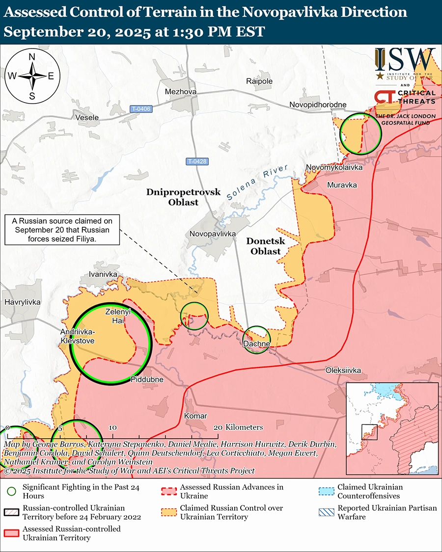 19 и 20 сентября российские войска атаковали в районе Новопавловки, к юго-востоку от Новопавловки в районе Дачного, к югу от Новопавловки в районе Филии и Толстое и к юго-западу от Новопавловки в районе Зеленого Гая. [77]