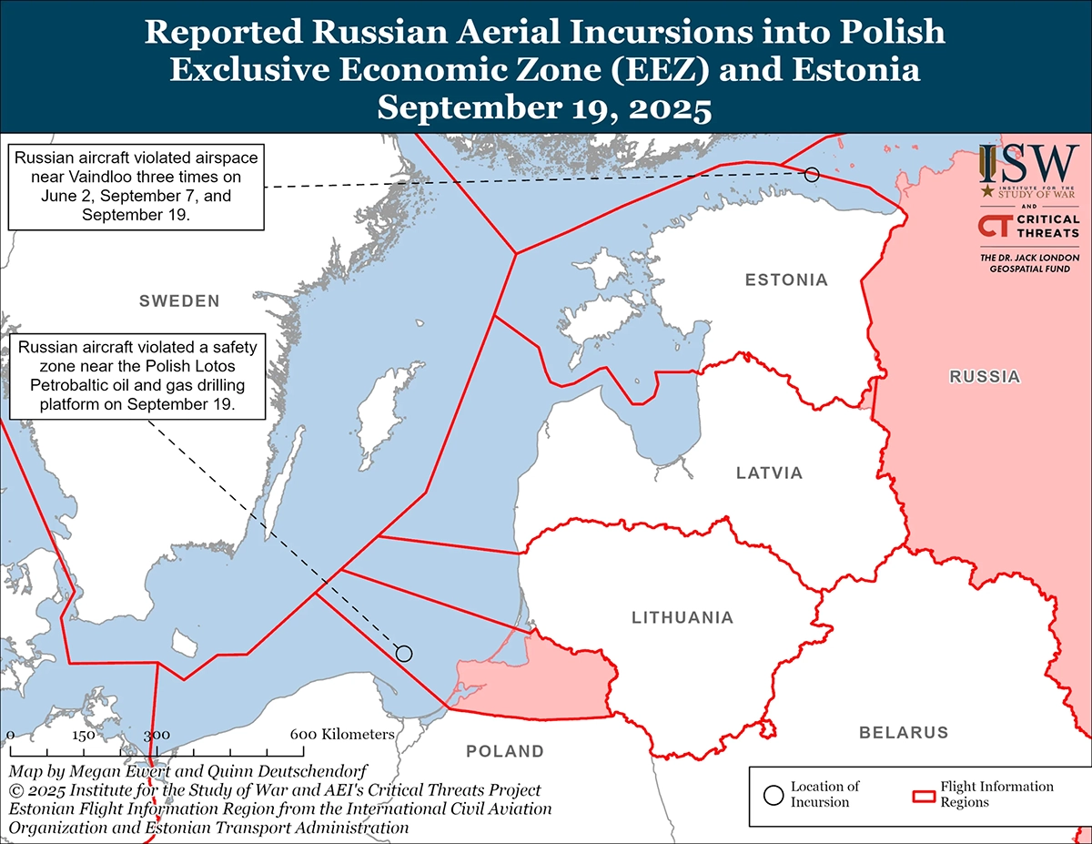 Россия активизирует свои усилия по проверке оборонительного потенциала и решимости НАТО, нарушая зоны безопасности членов НАТО в воздушном пространстве. Польские пограничники сообщили 19 сентября, что два российских истребителя выполнили проход на малой высоте над польской нефтегазовой платформой Lotos Petrobaltic в Балтийском море, что является прямым нарушением зоны безопасности платформы. [17] Польская государственная энергетическая компания Orlen Petrobaltic владеет и управляет платформой Petrobaltic и является единственной морской нефтяной платформой в Польше. [18] Пресс-секретарь Пограничной службы Польши Катержина Пшибыш заявила, а открытые источники данных о слежении за военно-морскими судами указывают на то, что буровая платформа Petrobaltic находится в исключительной экономической зоне Польши. [19] Остается неясным, произошло ли вторжение российских самолетов вблизи платформы Petrobaltic во время боевого вылета 19 сентября, в ходе которого три российских самолета-перехватчика МиГ-31 нарушили воздушное пространство Эстонии, или это был отдельный инцидент. [20] Министерство обороны России 19 сентября заявило, что российские самолеты не нарушали воздушное пространство Эстонии и что три российских самолета выполнили «регулярный полет» с аэродрома Карелия на неуказанный аэродром в Калининградской области в соответствии с международным правом. [21] ISW продолжает считать, что Россия намеренно проверяет пределы возможностей НАТО с помощью различных воздушных вторжений, пытаясь собрать данные о мерах реагирования альянса и политической воле, которые Россия может затем применить в потенциальных конфликтах против НАТО. [22]