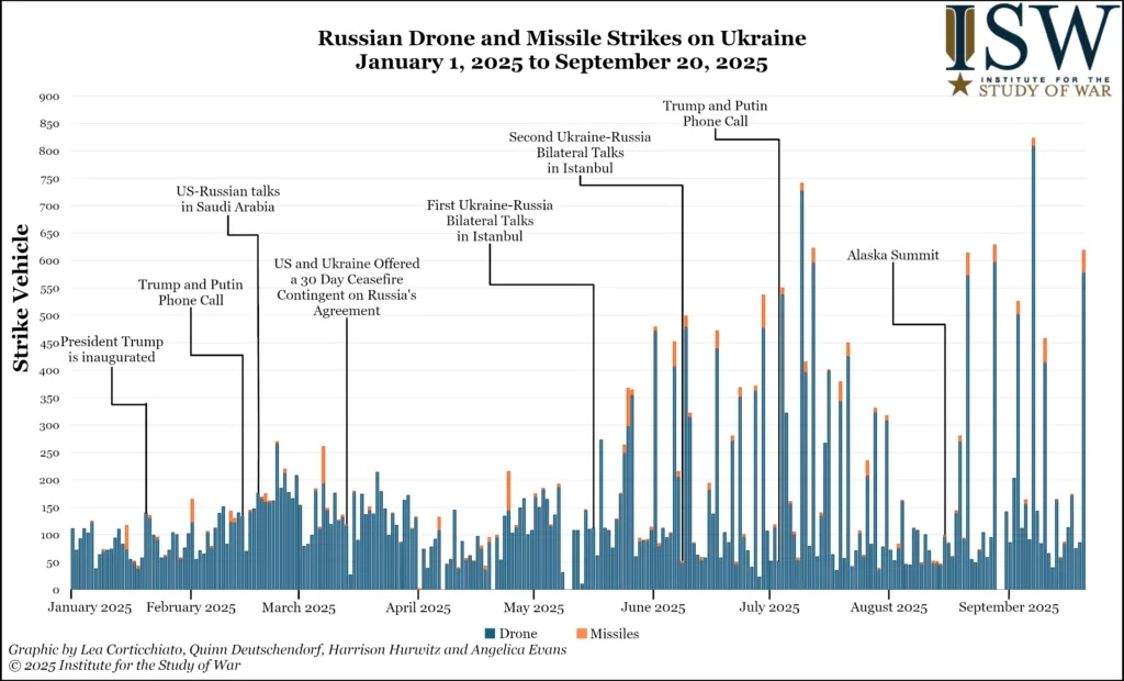 Инсайдерские заявления Кремля по-прежнему указывают на то, что президент России Владимир Путин по-прежнему привержен своей стратегии, что российские войска смогут выиграть войну на истощение против Украины и Запада, и что Западу до сих пор не удалось убедить Путина пересмотреть свою стратегию. Bloomberg сообщил 20 сентября, что неназванные люди, близкие к Кремлю, заявили, что Путин пришел к выводу, что военная эскалация является наилучшим способом для России принудить Украину к мирным переговорам на условиях Путина. [1] Источники заявили, что Путин оценивает, что президент США Дональд Трамп вряд ли «сделает много» для укрепления обороны Украины, и что американо-российские переговоры на Аляске 15 августа 2025 года убедили Путина, что Трамп не заинтересован во вмешательстве в войну в Украине. Источники заявили, что Путин намерен продолжать участвовать в любом продолжающемся двустороннем диалоге с Соединенными Штатами, но продолжит действовать в том, что он считает интересами России. Источники заявили, что Путин намерен продолжать наносить удары по энергетической сети Украины и другой критической инфраструктуре. Давняя теория победы Путина утверждает, что Россия может победить Украину в военном отношении, бесконечно сохраняя инициативу на театре военных действий и превзойдя военную поддержку Украины со стороны Запада. [2] Заявления источников указывают на то, что недавние усилия США по посредничеству в мирном урегулировании войны в Украине не повлияли на расчеты Путина и что Путин по-прежнему привержен победе над Украиной военным путем, как продолжает оценивать ISW. Недавние действия Путина, в том числе решение о передислокации дополнительных сил в Донецкую область и недавние вторжения России в воздушное пространство государств-членов НАТО, еще больше подчеркивают его приверженность как продолжению военной агрессии против Украины, так и будущей военной агрессии против государств-членов НАТО. [3]