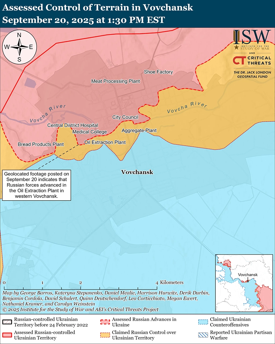 Оценка продвижения российских войск: геолоцированные кадры, опубликованные 20 сентября, указывают на то, что российские войска недавно продвинулись вперед на Волчанском маслоэкстракционном заводе в западной части Волчанска (к северо-востоку от Харькова). [38]