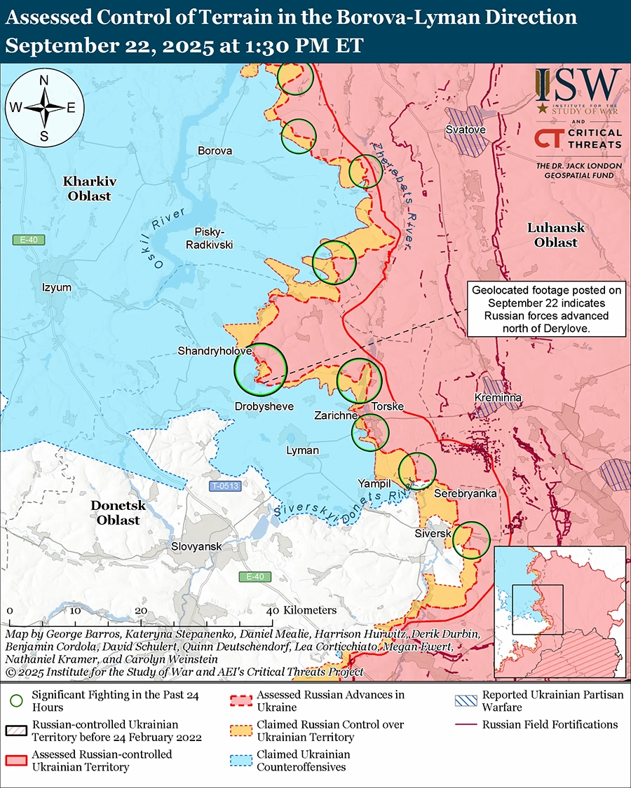 Оценка российского продвижения: геолоцированные кадры, опубликованные 22 сентября, указывают на то, что российские войска недавно продвинулись к северу от Дерилово и к востоку от Шандриголово (оба к северо-западу от Лимана). [56] По оценкам ISW, российское наступление к северу от Дерилово, скорее всего, не произошло за последние 24 часа.