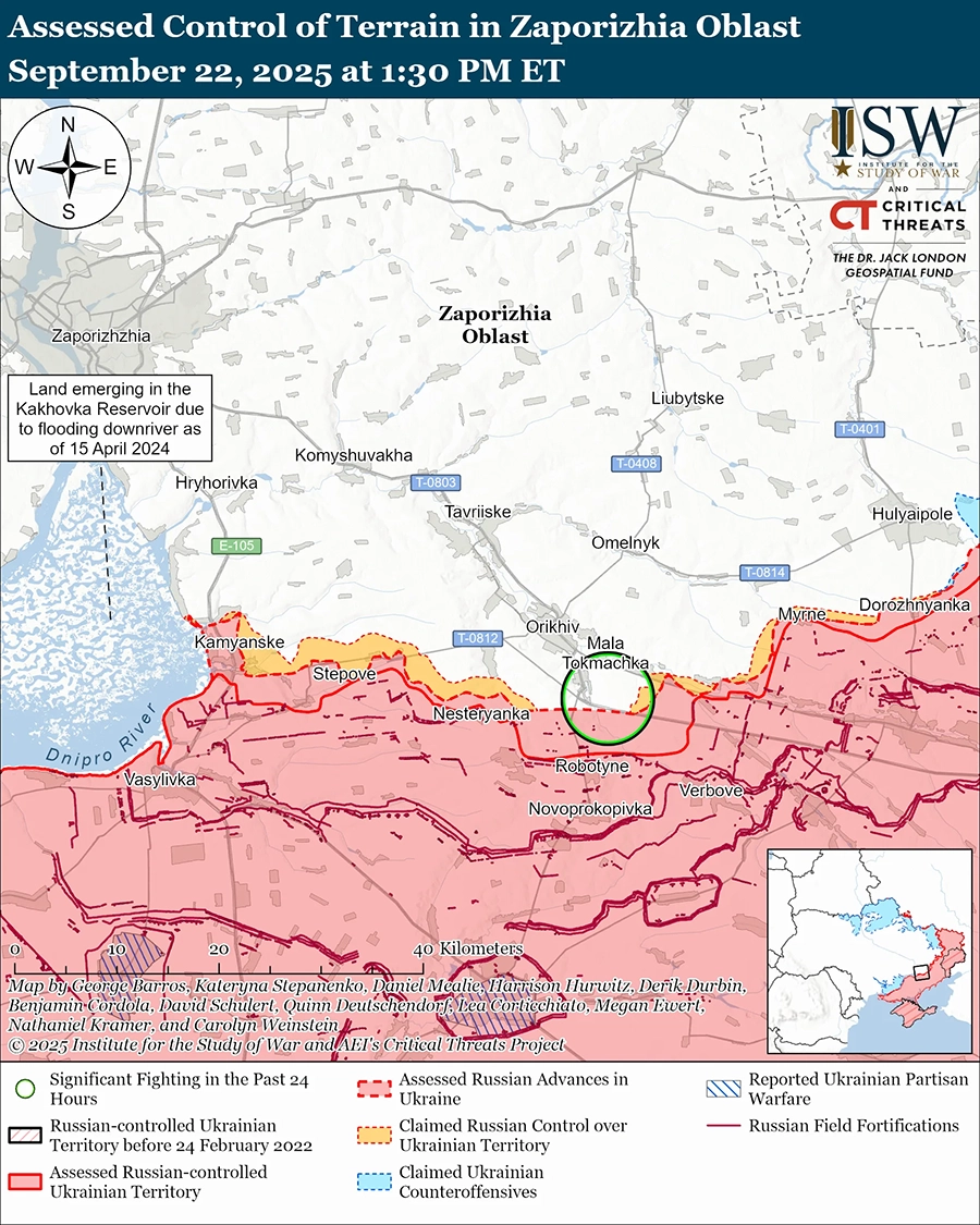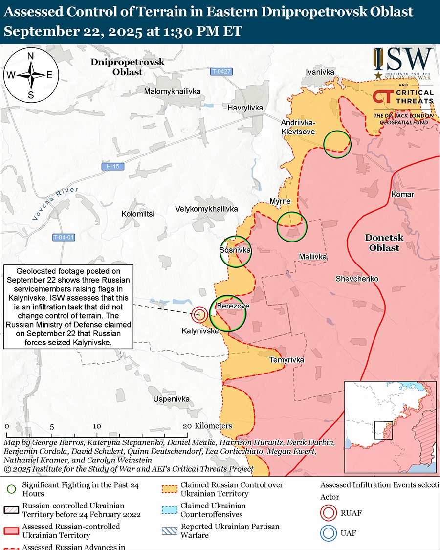 Неподтвержденные утверждения: российские источники, в том числе Министерство обороны РФ, 22 сентября сообщили, что российские войска захватили Калиновское (к юго-востоку от Великомихайловки). [95] Российские военные блогеры утверждали, что в предполагаемом захвате участвовали военнослужащие 5-й танковой бригады (36-я ОА, Восточный военный округ). [96] Пресс-секретарь Днепровской группировки войск подполковник Алексей Бельский опроверг заявление Минобороны РФ, заявив, что российские войска направляют большое количество небольших групп в составе двух-пяти солдат для проникновения в населенные пункты, чтобы снимать кадры предполагаемых захватов. [97] Бельский заявил, что российские войска могут проникать глубоко в ближний тыл Украины благодаря использованию камуфляжа, в том числе антитепловизионных плащей, но украинские войска быстро уничтожают российские группировки. На геолоцированных кадрах, опубликованных 22 сентября, видно, как трое российских военнослужащих поднимают флаги на северо-западе Калиновского (к югу от Великомихайловки). [98] По оценкам ISW, российские войска, вероятно, проводили операции по проникновению в Калиновское, но не захватили населенный пункт. Российский военный блогер также заявил, что российские войска продвинулись к северо-востоку от Степного (к югу от Великомихайловки). [99]