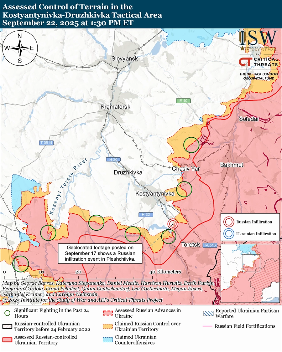 Оценка российского продвижения: геолоцированные кадры, опубликованные 22 сентября, указывают на то, что российские войска незначительно продвинулись к юго-востоку от Предтечино (к востоку от Константиновки). [68]