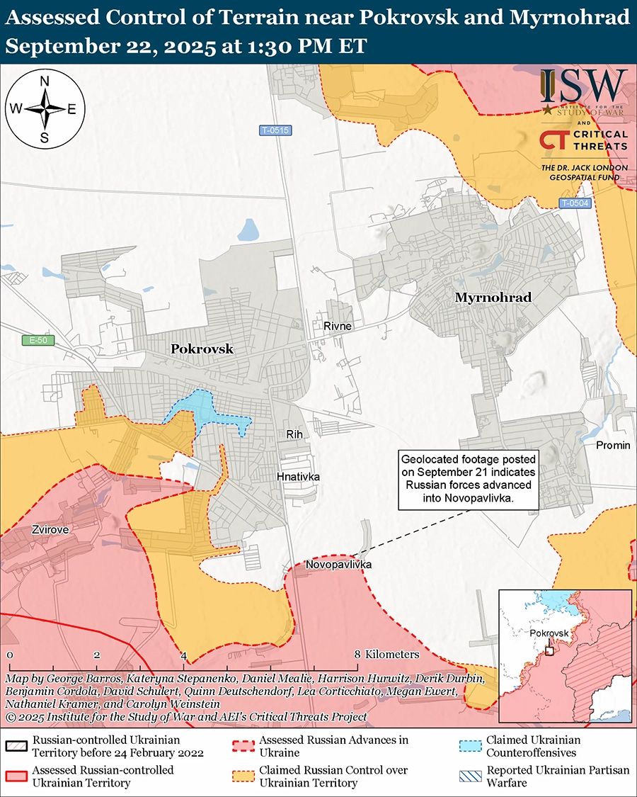 Оценка российского продвижения: кадры, опубликованные 20 сентября и геолоцированные 21 сентября, указывают на то, что российские войска недавно продвинулись в центральную часть Новопавловки (к югу от Покровска). [86]