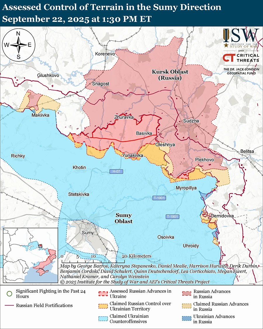 Оценка украинского продвижения: 22 сентября российский военный блогер признал, что украинские войска недавно продвинулись в северо-восточную часть Нового Шахово (к востоку от Доброполья), указывая на то, что украинские силы, вероятно, продвинулись, поскольку у российских военных блогеров нет стимула признавать ложные украинские успехи. [80]