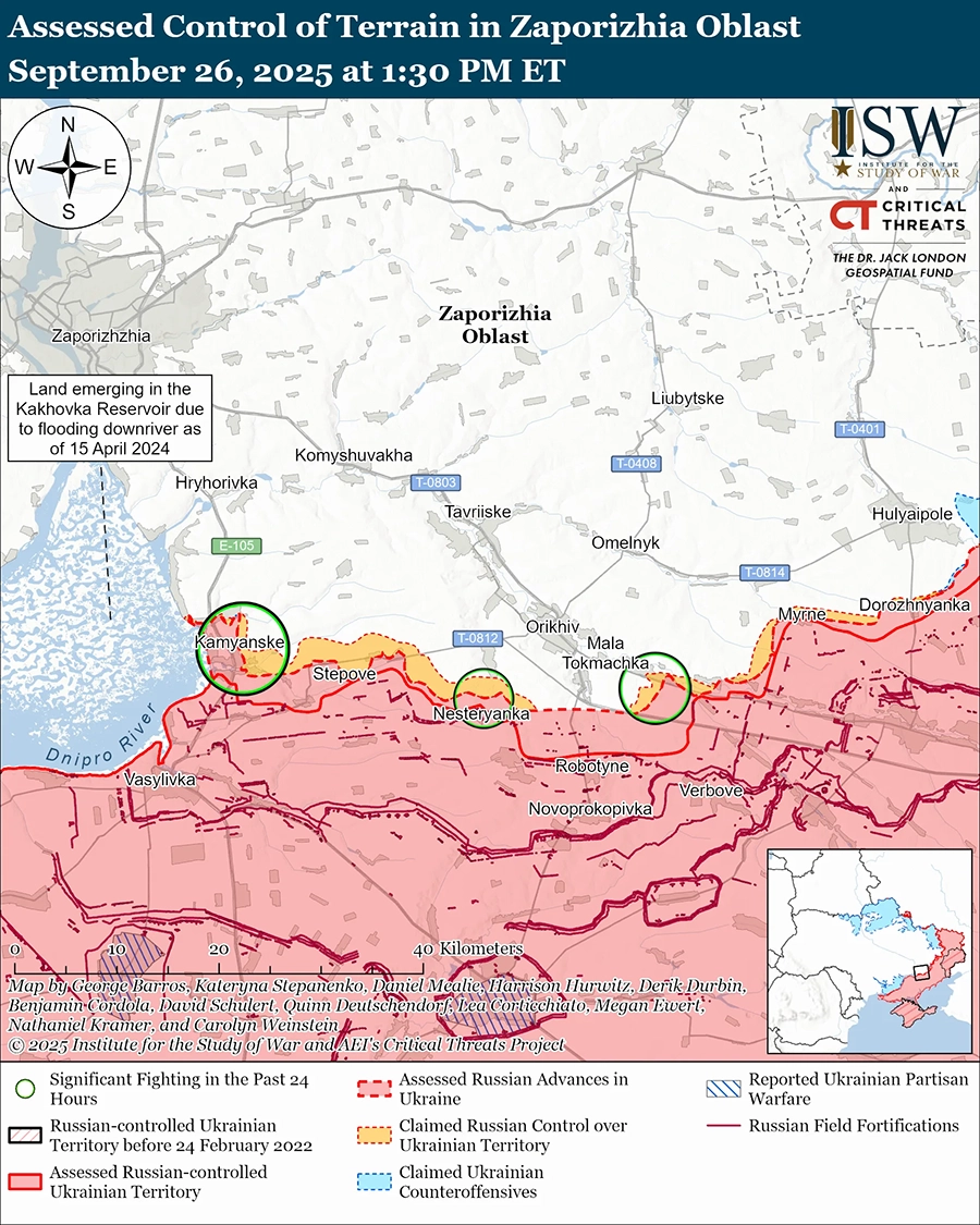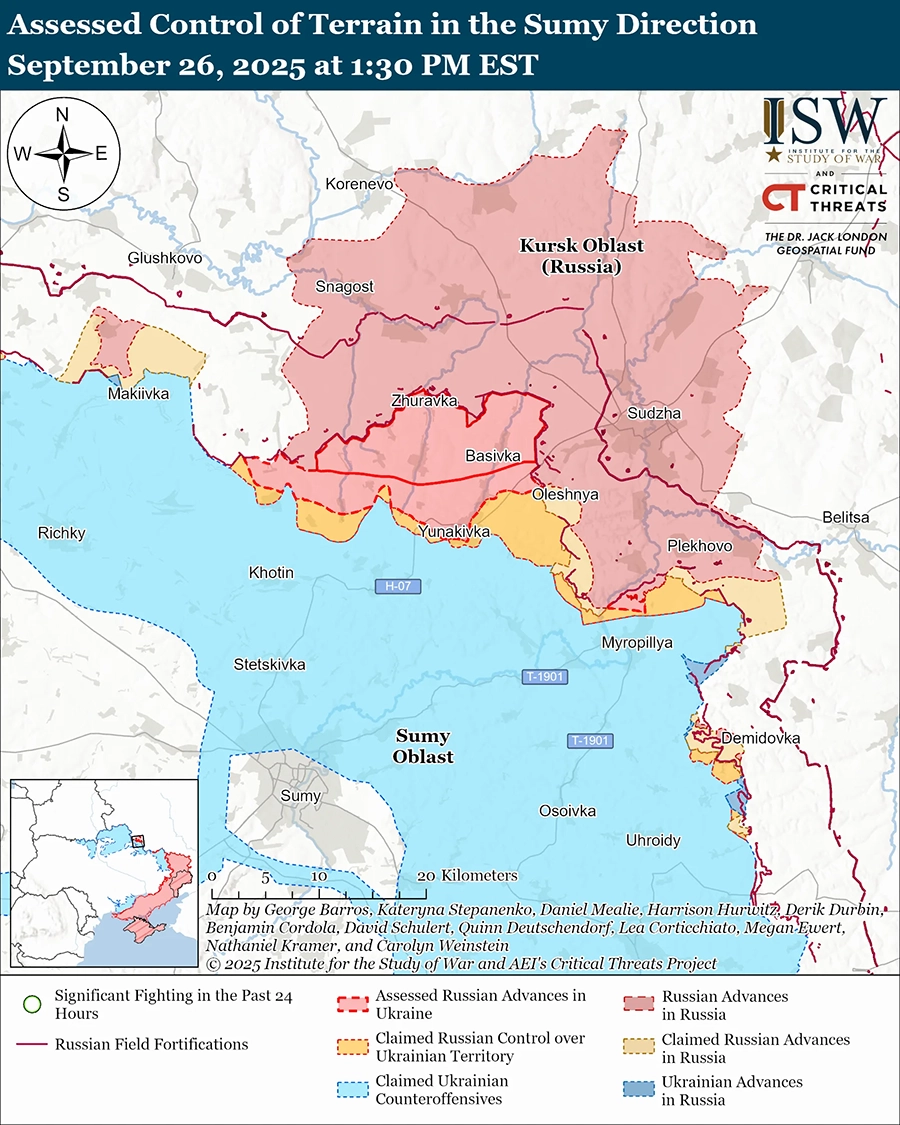 Президент Украины Владимир Зеленский сообщил 26 сентября, что с августа 2025 года украинские войска захватили 168,8 квадратных километров на Добропольском направлении и зачистили еще 187,7 квадратных километров от российских диверсионных групп в этом районе. [54] По данным ISW, с 15 августа украинские войска отбили 68,6 квадратных километров в тактическом районе Доброполья. Украинские силы, вероятно, захватили больше территории в районе Доброполья, чем в настоящее время указывают имеющиеся данные, и ISW продолжит обновлять свои карты в районе Доброполья на основе имеющихся доказательств украинского наступления
