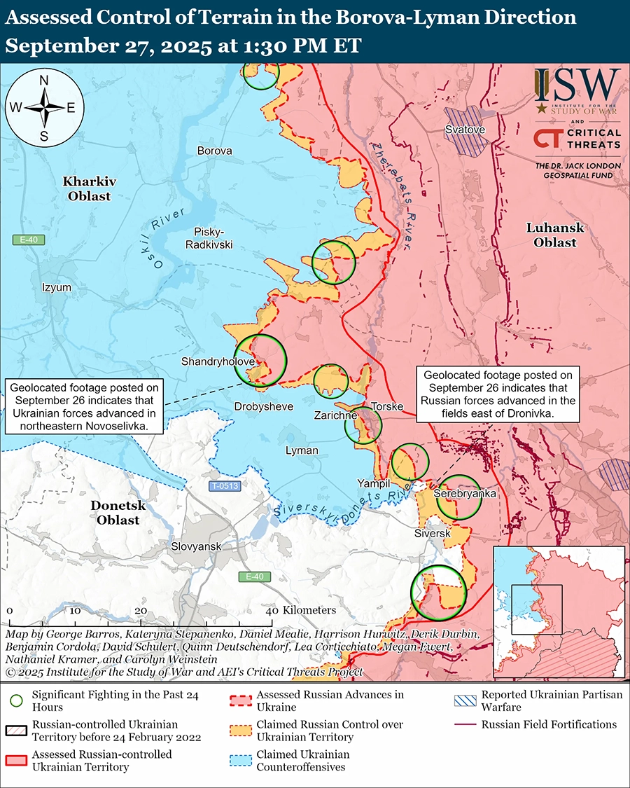Оценка украинского продвижения: геолоцированные кадры, опубликованные 27 сентября, указывают на то, что российские заявления о том, что российские войска захватили восточную часть Новоселовки (к северо-западу от Лимана), являются ложными и что украинские войска удерживали позиции или продвинулись в этом районе. [28]