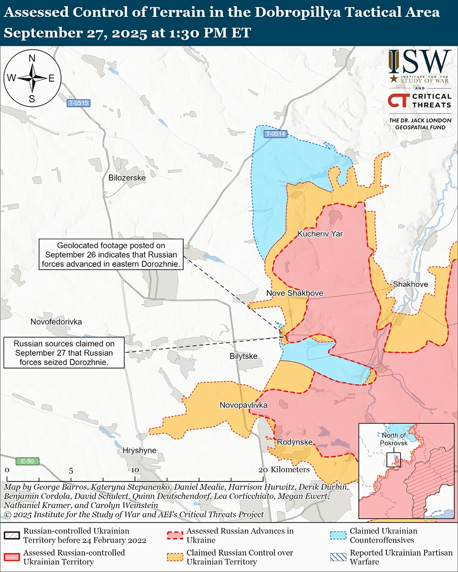 Оценка российского продвижения: геолоцированные кадры, опубликованные 26 сентября, указывают на то, что российские войска недавно продвинулись в восточную часть Дорожного (к юго-востоку от Доброполья). [46]