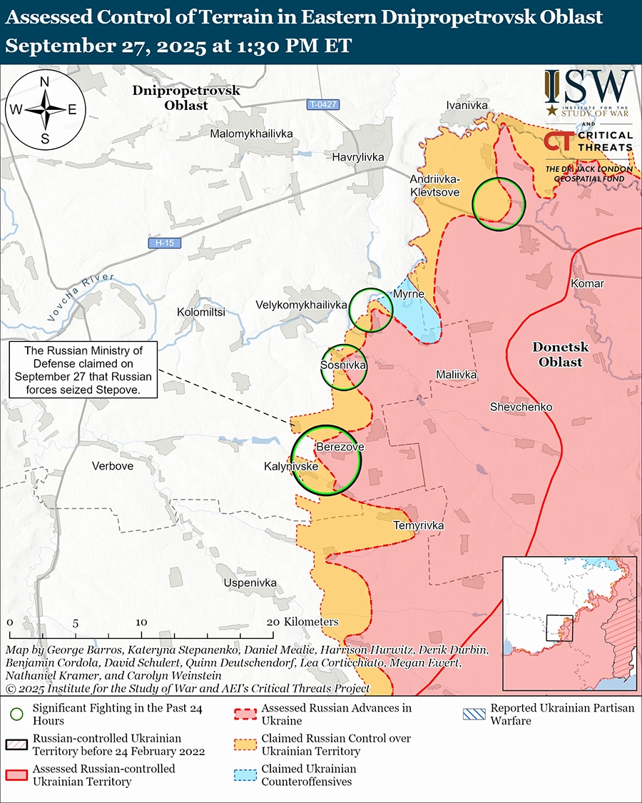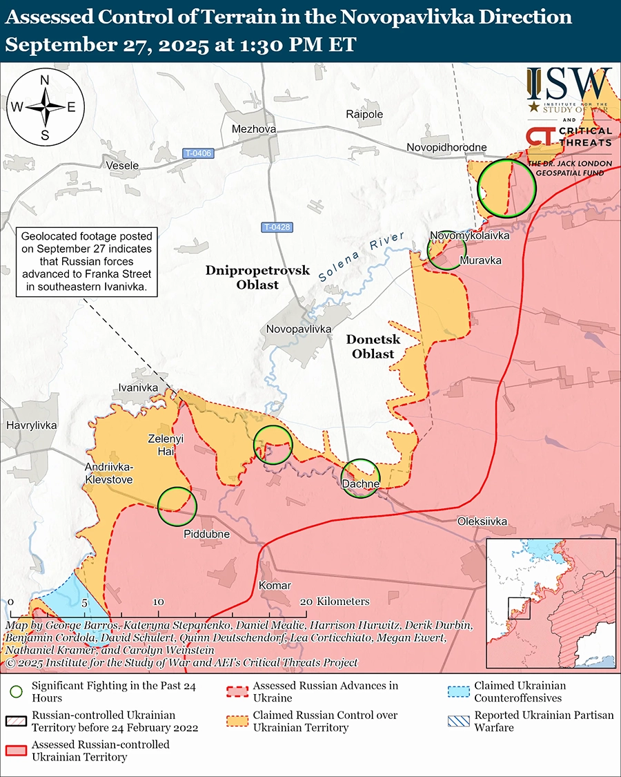 Оценка российского продвижения: геолоцированные кадры, опубликованные 27 сентября, указывают на то, что российские войска недавно продвинулись в юго-восточной части Ивановки (к юго-западу от Новопавловки). [56]