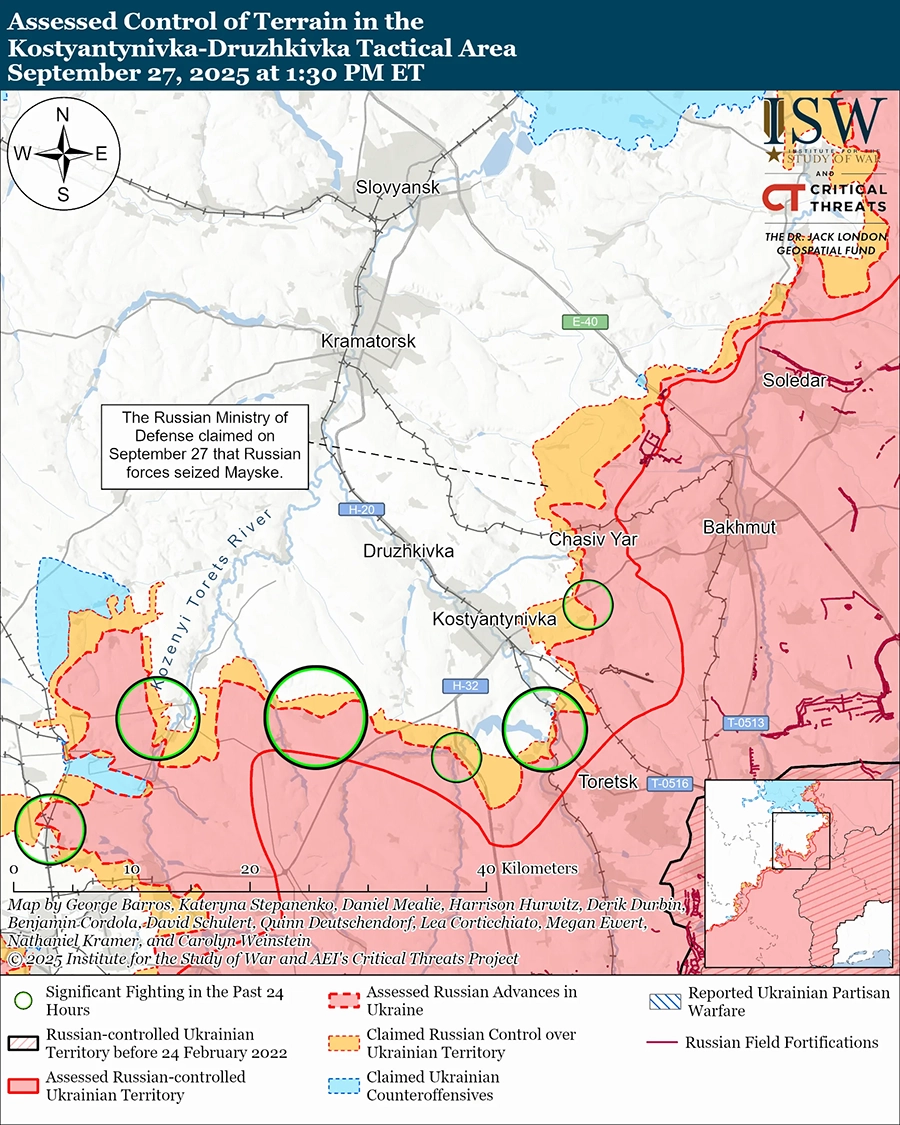 Оценка российского продвижения: геолоцированные кадры, опубликованные 27 сентября, указывают на то, что российские войска недавно продвинулись к северо-востоку от Дроновки (к северо-западу от Северска). [33]