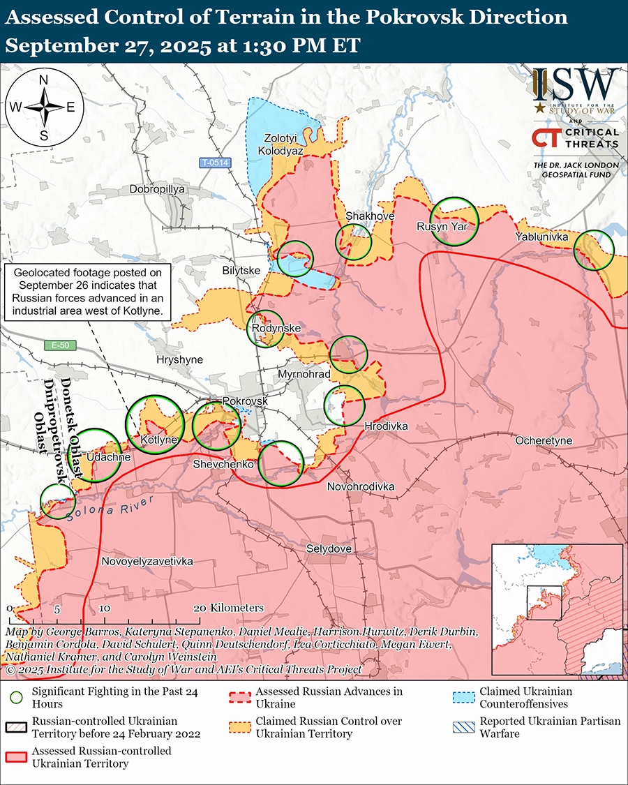 Оценка российского продвижения: геолоцированные кадры, опубликованные 27 сентября, указывают на то, что российские войска в последнее время незначительно продвинулись к западу от Котлино (к юго-западу от Покровска). [50]