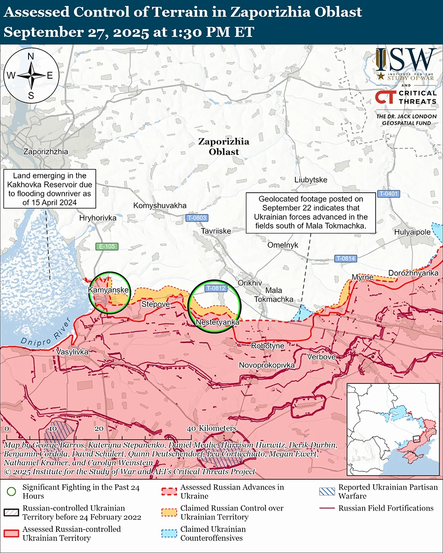 Оценка украинского наступления: геолоцированные кадры, опубликованные 22 сентября, указывают на то, что украинские войска недавно отбили позиции к югу от Малой Токмачки (к юго-востоку от Орехова). [64]