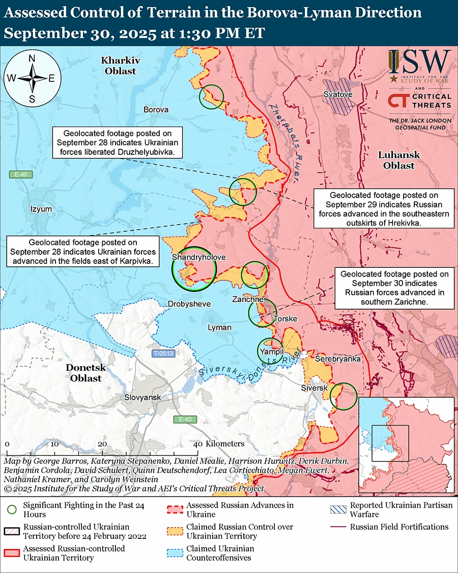 Оценка российского продвижения: геолоцированные кадры, опубликованные 29 сентября, указывают на то, что российские войска в последнее время незначительно продвинулись на юго-восточных окраинах Грековки (к юго-востоку от Боровой). [36]