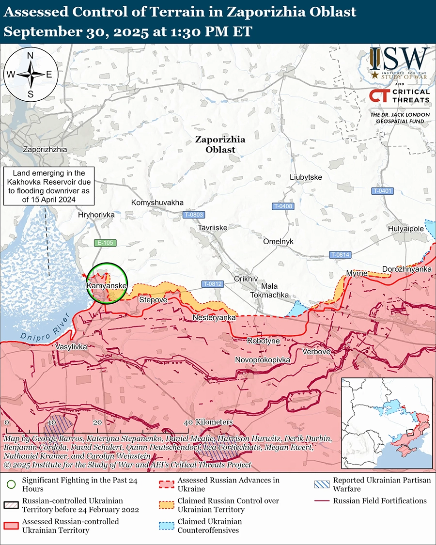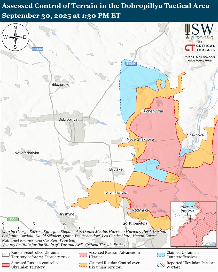 Уточнение местности в соответствии с российскими заявлениями: геолоцированные кадры, опубликованные 30 сентября, указывают на то, что российские заявления о том, что российские войска захватили позиции в северном Удачном (к юго-западу от Покровска), являются ложными, и что украинские войска удерживают позиции или продвинулись в этом районе. [63]