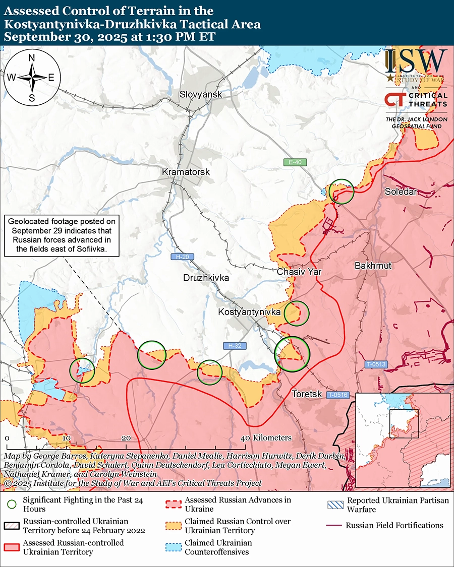 Оценка российского продвижения: геолоцированные кадры от 29 сентября указывают на то, что российские войска продвинулись к берегу водоема к востоку от Софиевки (к юго-западу от Дружковки). [53]