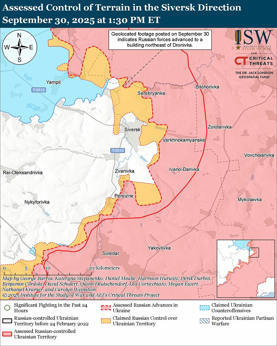 Оценка российского продвижения: геолоцированные кадры, опубликованные 30 сентября, указывают на то, что российские войска продвинулись к северо-востоку от Дроновки (к северу от Северска). [47]