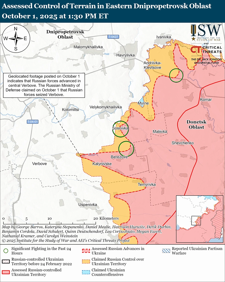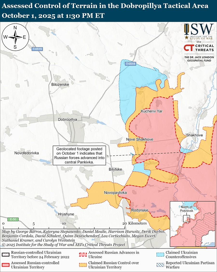 Оценка российского продвижения: геолоцированные кадры, опубликованные 1 октября, указывают на то, что российские войска недавно продвинулись в южную часть Паньковки (к юго-востоку от Доброполья). [74]
