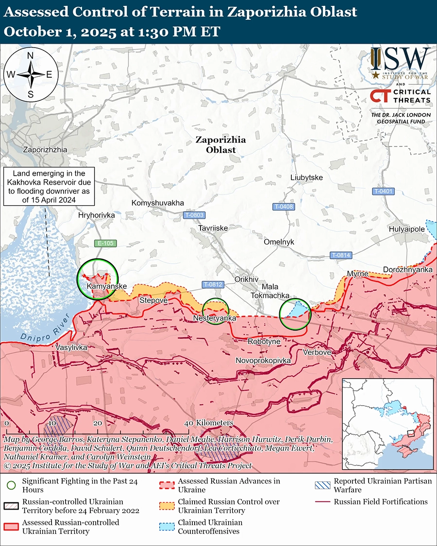 Оккупированная Россией Запорожская атомная электростанция (ЗАЭС) уже более недели отключена от энергосистемы Украины, поскольку Россия выдвигает условия для скорого перевода станции в российскую энергосистему. 30 сентября представители Украины и Международного агентства по атомной энергии (МАГАТЭ) сообщили, что с 23 сентября ЗАЭС отключена от энергосистемы Украины и использует резервные дизельные генераторы для обслуживания систем охлаждения реакторов. [28] Украинские официальные лица заявили, что в результате российских обстрелов была повреждена последняя действующая украинская линия электропередачи, ведущая к ЗАЭС, а МАГАТЭ заявило, что повреждения произошли примерно в 1,5 километрах от самой ЗАЭС. Повреждение линий электропередач ЗАЭС приводило к отключению ЗАЭС от украинской энергосистемы еще девять раз с момента полномасштабного вторжения до 23 сентября, а нынешнее отключение электроэнергии является самым длительным за всю историю ЗАЭС. [29] Президент Украины Владимир Зеленский и мэр Энергодара в изгнании Дмитрий Орлов заявили, что один из дизельных генераторов, поддерживающих ЗАЭС, вышел из строя, так как дизельные генераторы не рассчитаны на работу в течение такого длительного периода времени. [30] Орлов заявил, что продолжающиеся российские обстрелы этого района не позволяют украинским властям отремонтировать линию электропередачи. [31] Генеральный директор МАГАТЭ Рафаэль Гросси заявил, что непосредственной опасности для ЗАЭС нет, но работа на дизельных генераторах неустойчива. [32] Гросси заявил, что Украина готова отремонтировать еще одну ЛЭП к ЗАЭС, которая была отключена с мая 2025 года, но «военная ситуация» не позволила Украине отремонтировать эту ЛЭП. Российские официальные лица опровергли сообщения о российских обстрелах и обвинили украинские удары в повреждении линии электропередач к ЗАЭС. [33] Гринпис Украины проанализировал спутниковые снимки повреждений ЛЭП с 23 сентября и пришел к выводу, что обстрелов ЛЭП не было, что позволяет предположить, что российские войска проводили диверсионные операции против ЛЭП. [34]