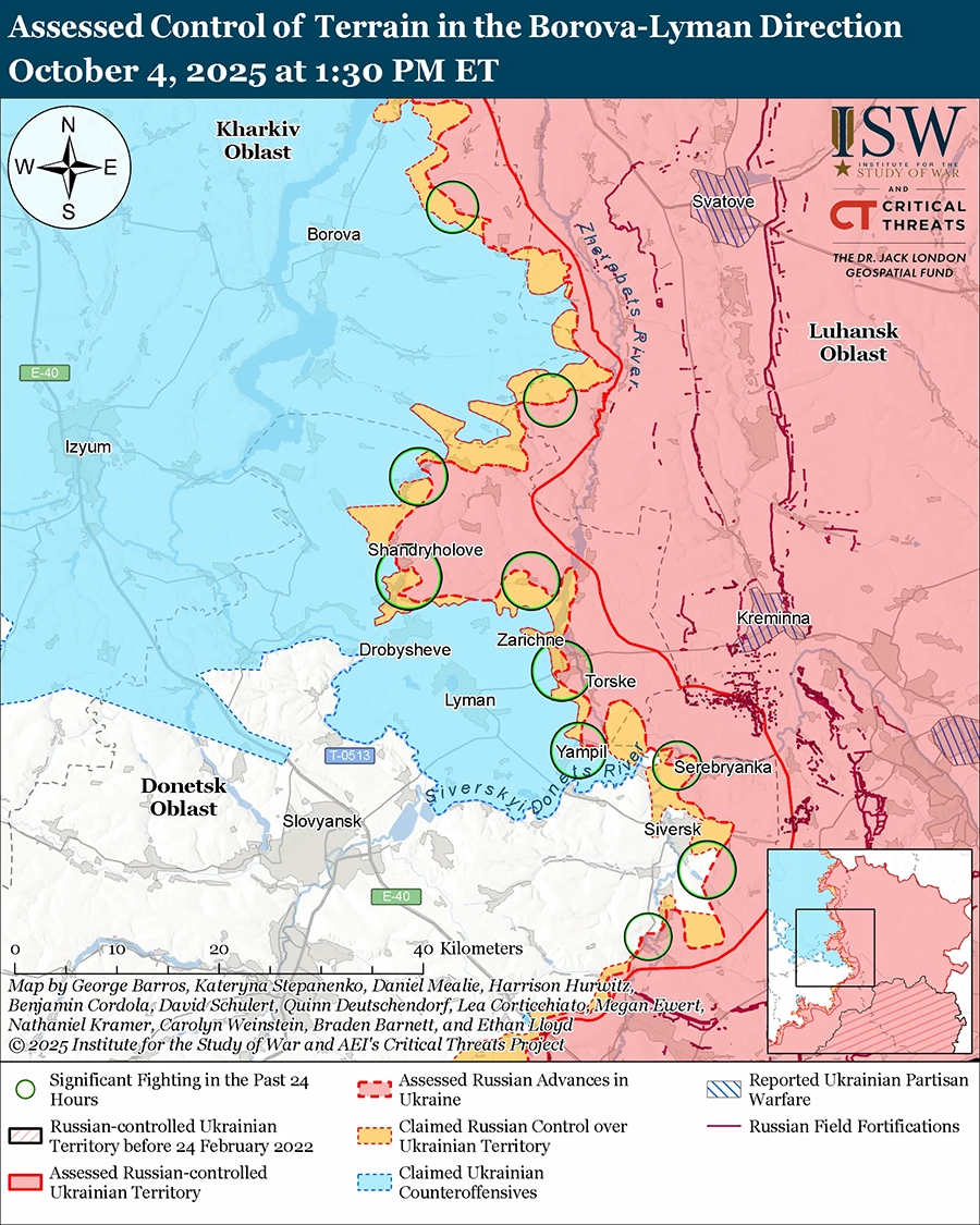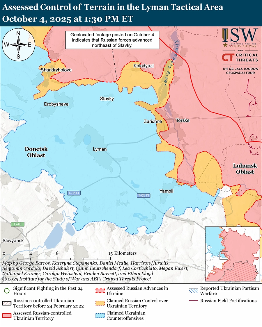 Оценка российского продвижения: геолоцированные кадры, опубликованные 4 октября, указывают на то, что российские войска недавно продвинулись к северо-востоку от Ставок (к северу от Лимана). [30]