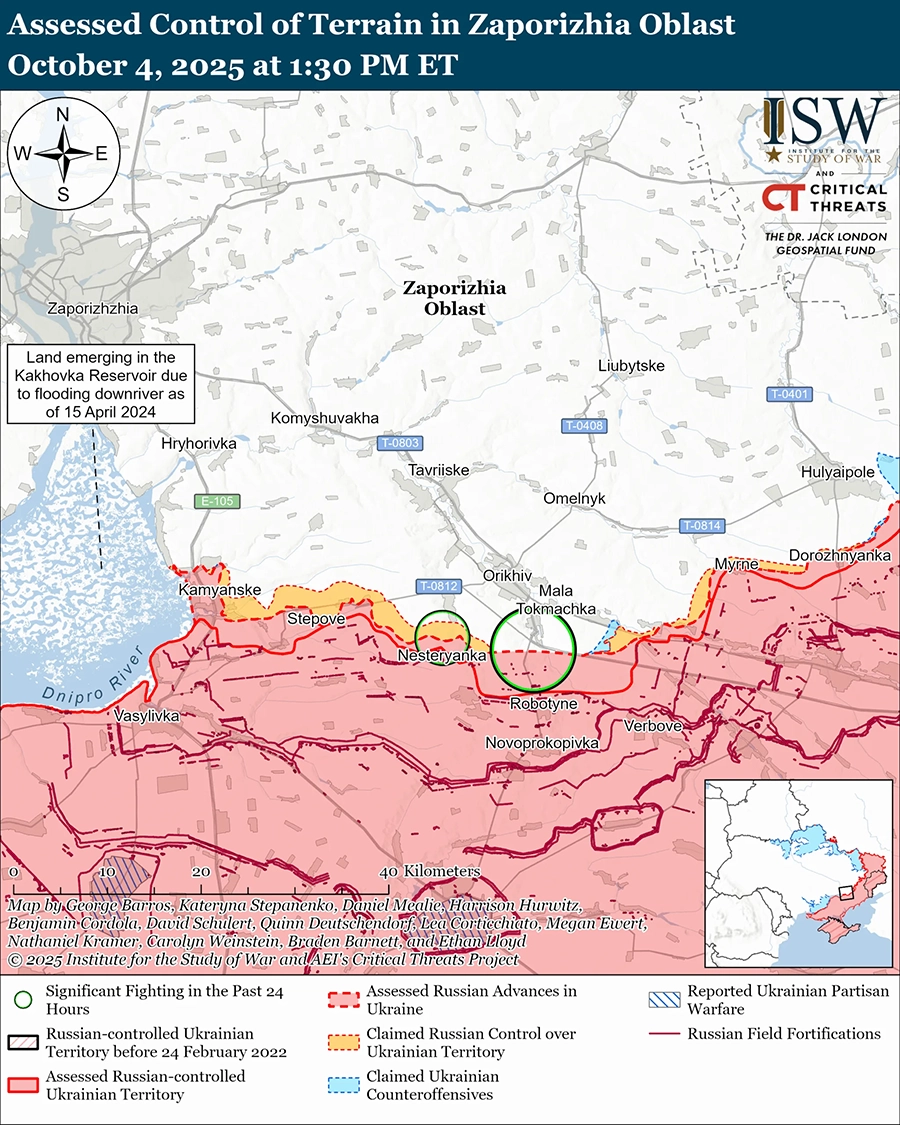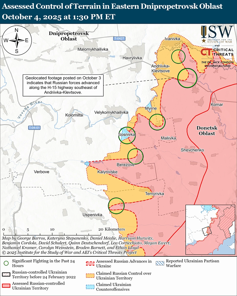Оценка российского продвижения: геолоцированные кадры, опубликованные 3 октября, указывают на то, что российские войска недавно продвинулись вдоль трассы H-15 Донецк-Запорожье к юго-востоку от Андреевки-Клевцово (к северо-востоку от Великомихайловки). [74]