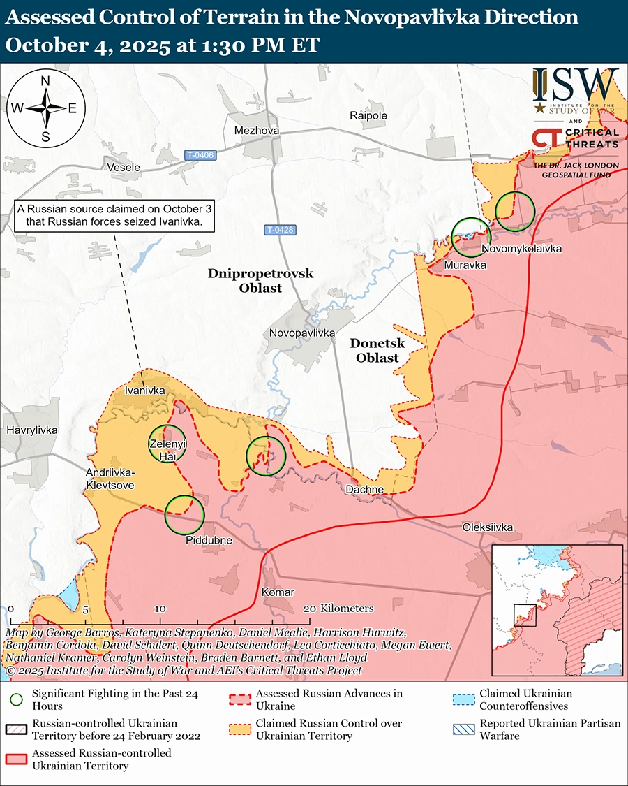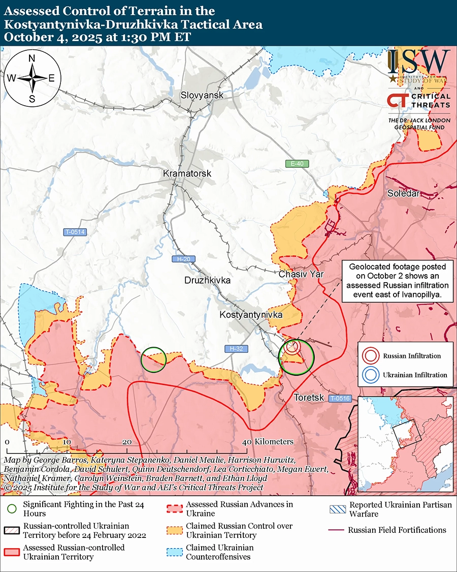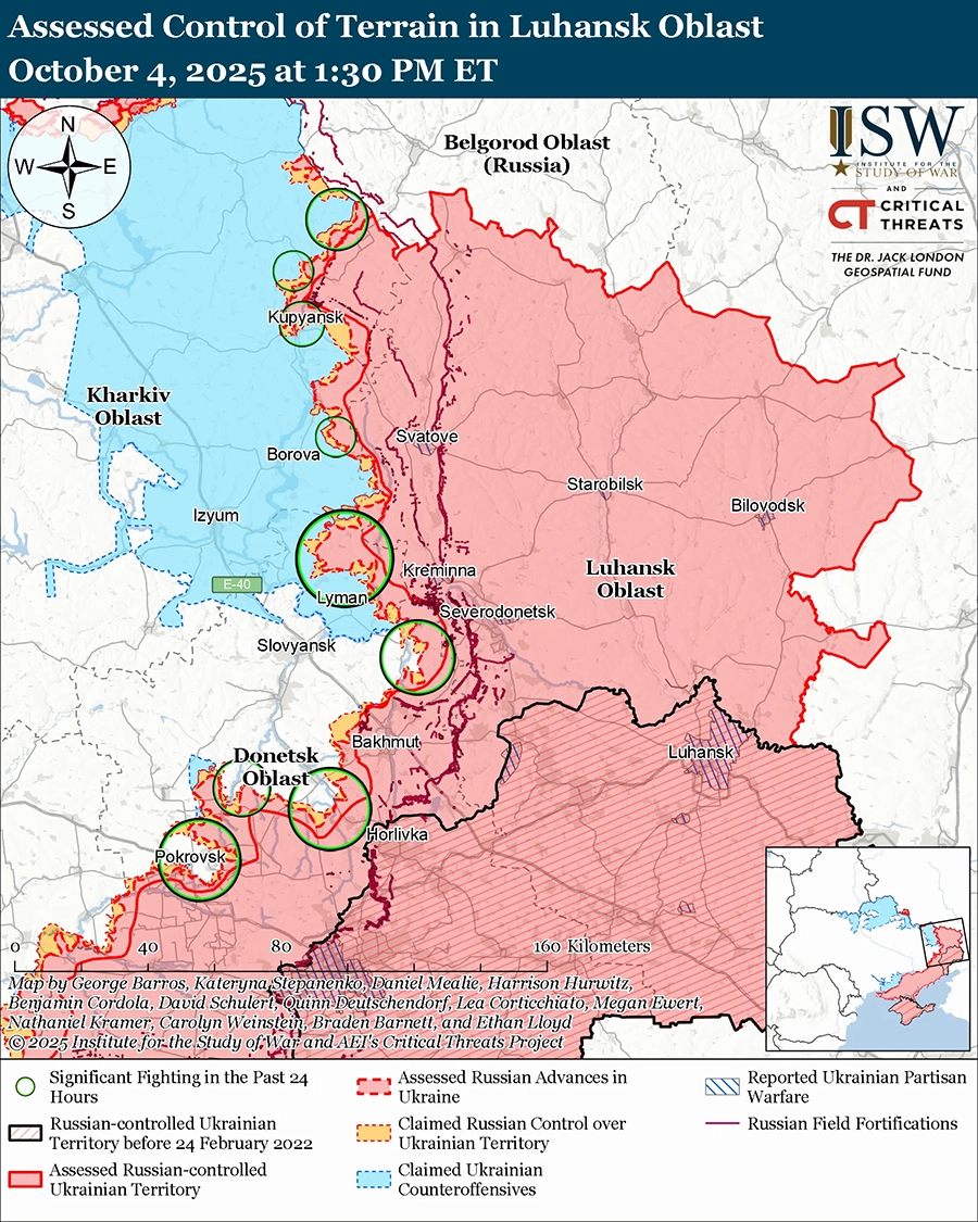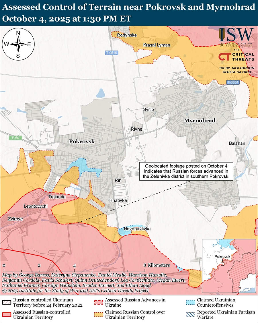 Оценка продвижения российских войск: геолоцированные кадры, опубликованные 3 и 4 октября, указывают на то, что российские войска недавно продвинулись в южной части Покровска и на северо-восточных окраинах Красного Лимана (к северо-востоку от Покровска). [62]