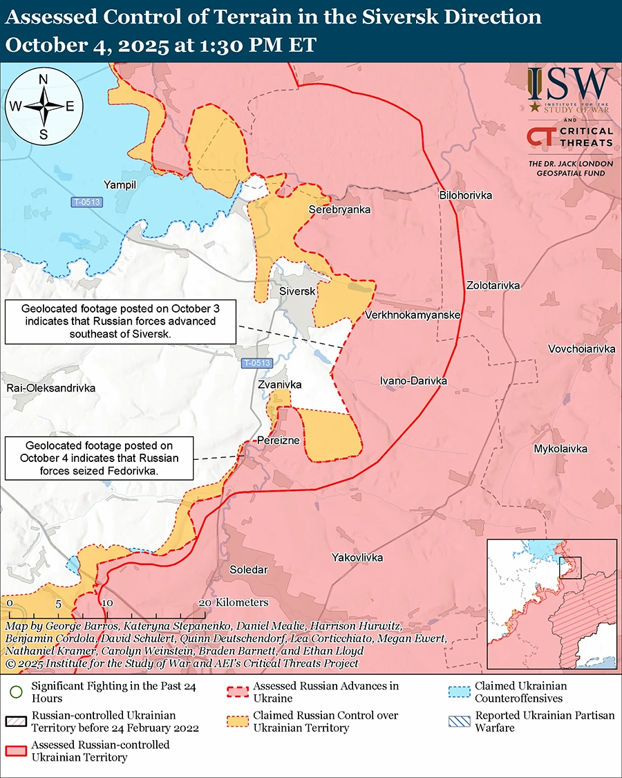 Оценка российского продвижения: геолоцированные кадры, опубликованные 3 октября, указывают на то, что российские войска недавно продвинулись к юго-востоку от Северска. [38] На геолоцированных кадрах, опубликованных 4 октября, видны подразделения 85-й мотострелковой бригады (3-я общевойсковая армия, бывший 2-й армейский корпус Луганской Народной Республики, Южный военный округ) поднимают российские флаги на западе и севере Федоровки (к юго-западу от Северска), что указывает на то, что российские войска недавно захватили населенный пункт. [39]